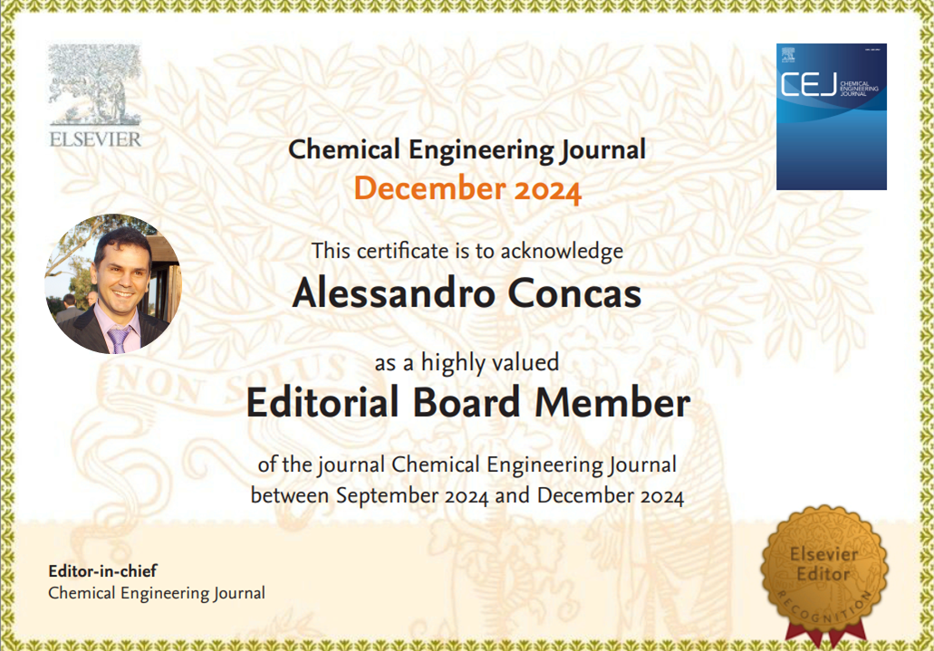 Il Prof. Alessandro Concas, direttore del Centro Interdipartimentale di Ingegneria e scienze Ambientali e afferente del Dipartimento di Ingegneria Meccanica, Chimica e dei Materiali è stato nominato membro dell’Editorial Board della rinomata rivista "CHEMICAL ENGINEERING JOURNAL (ELSEVIER)”, una tra le più autorevoli riviste scientifiche a livello internazionale nel campo dell’Ingegneria Chimica e delle sue applicazioni nel Settore Ambientale.
