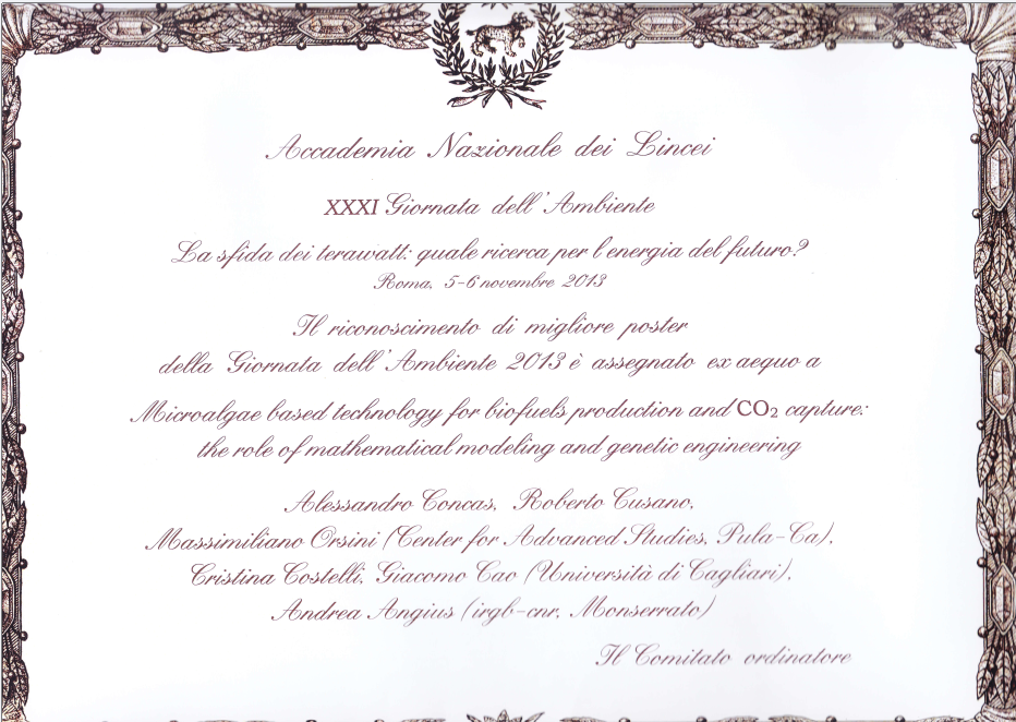 The poster entitled “Microalgae based technology for biofuels production and CO2 capture: the role of mathematical modeling and genetic engineering” by Concas Alessandro et al., wiht CINSA as main affiliation, has been awarded as the best poster in the international Conference "THE TERAWATT CHALLENGE: WHAT RESEARCH FOR THE ENERGY OF THE FUTURE” held by the presigious Academy of Lincei in Rome, 5-6 Novembere 2013 .