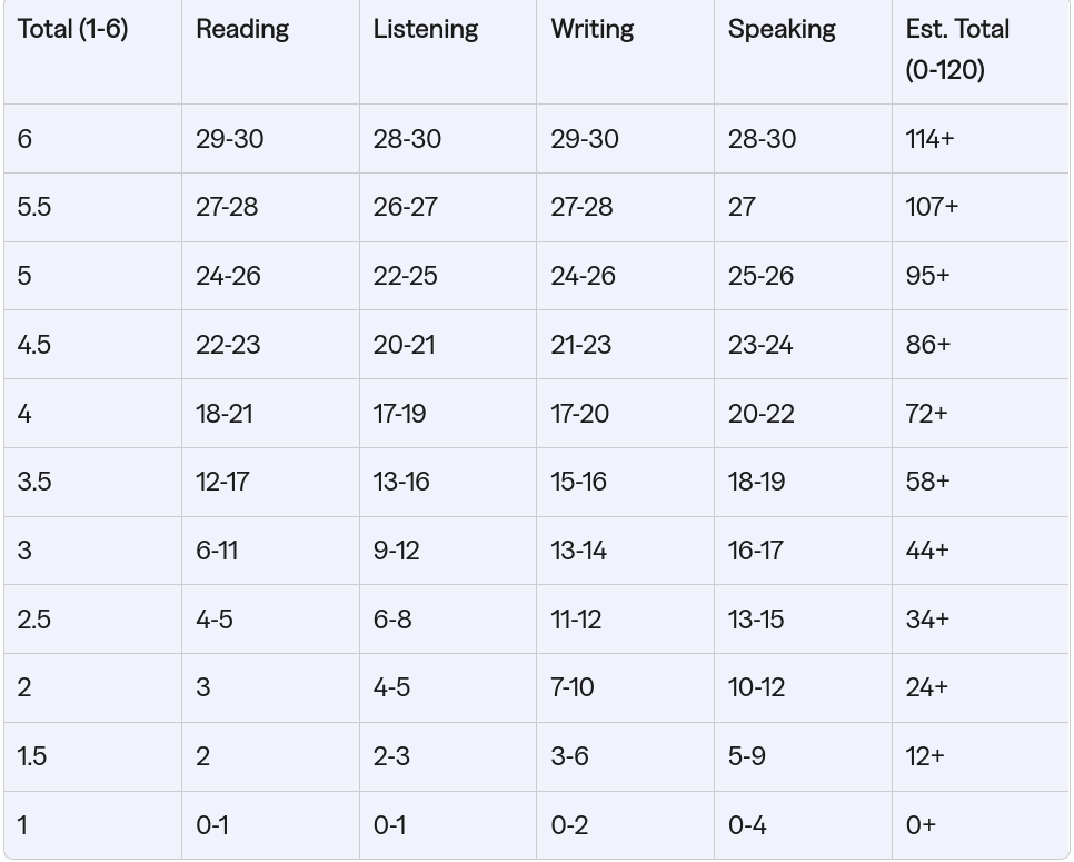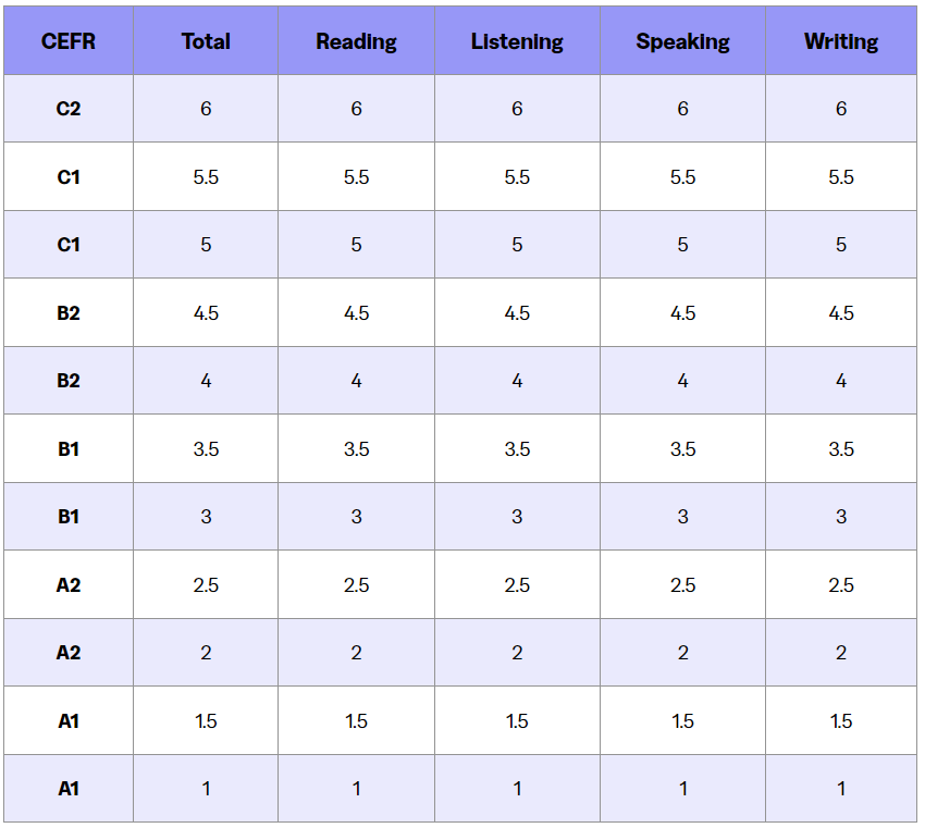 Scores (For exams taken before January 21, 2026): from 0 to 120, aligned with the CEFR scale from B1 to C2. The final exam score is issued on a maximum achievable score of 120 points, the sum of the 4 main sections of the test, each calculated on a scale from 0 to 30 points.