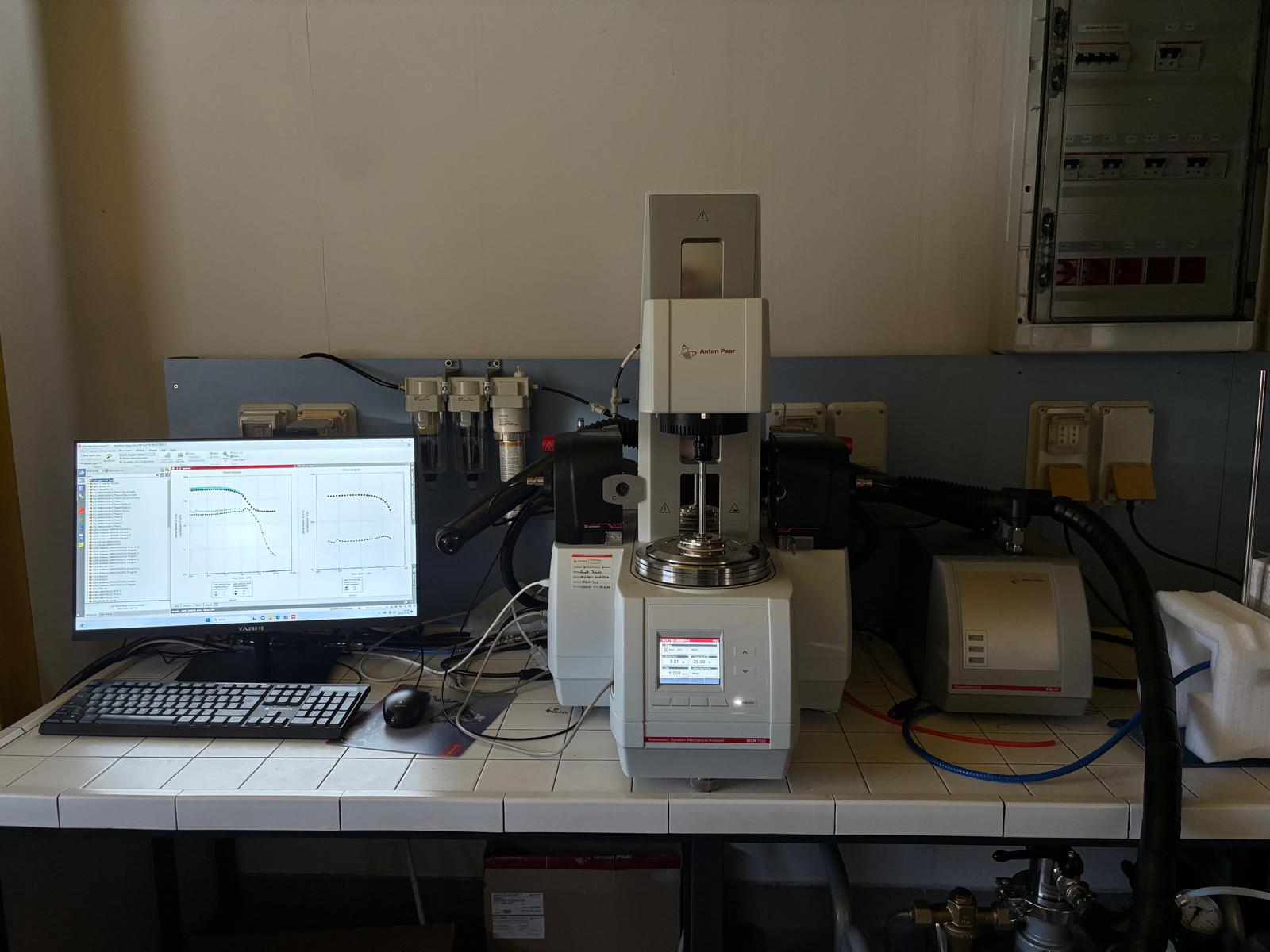 The MCR 702e MultiDrive rheometer, in the dual-motor configuration with CTD600 temperature control system and EVU20, enablea measurements from 16o to 600 °C. The rheometer can be used in a parallel-plate system for standard flow and frequency rheological analysis, with steel plates. Alternatively, instead of the CTD600 system, a Peltier system can be used, which allows for rapid sample heating. A photorheology tool is available, featuring a quartz plate connected to an Omnicure lamp with a broad emission spectrum. Using a second motor, is possibile to perform dynamic mechanical analysis (DMA) in torsion, tension, or compression modes, as well as creep tests, relaxation tests, and thermomechanical analysis.
