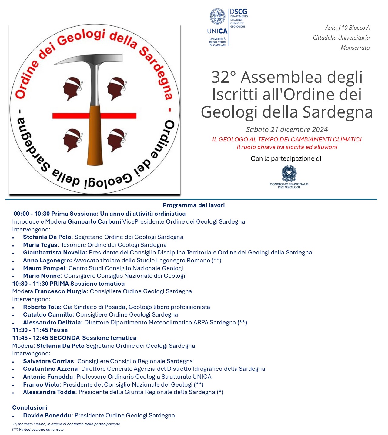 Iscrizioni: Per facilitare l’organizzazione, gli interessati possono inviare una mail di conferma della partecipazione alla segreteria dell’Ordine (geologi.sardegna@tiscali.it. Si ricorda che l’Assemblea potrà essere seguita esclusivamente in presenza.