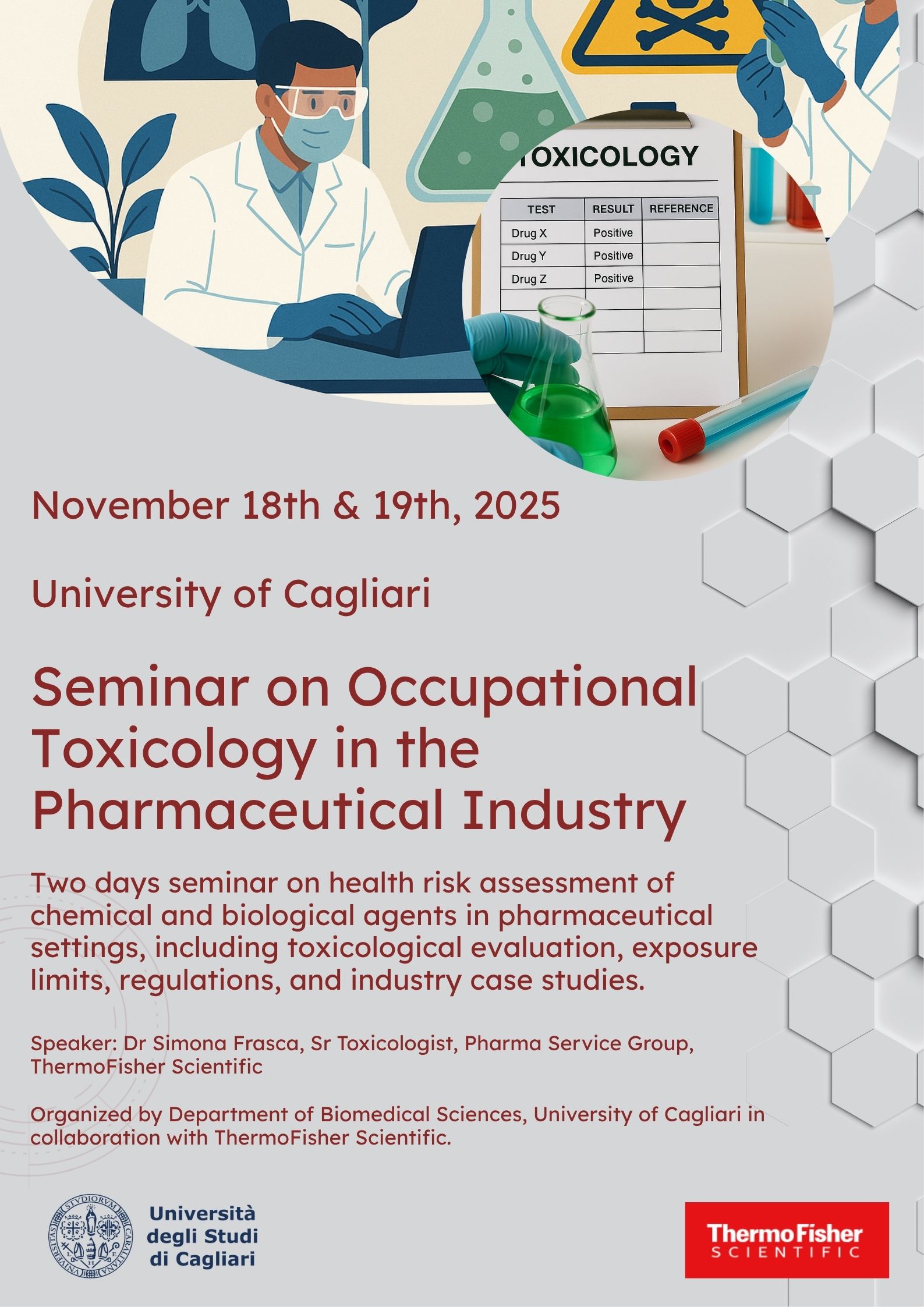 Si comunica agli studenti del Corso di Laurea in Scienze Tossicologiche e Controllo di Qualità (STCQ) che nei giorni 18 e 19 novembre 2025, la Dott.ssa Simona Frasca (Toxicologist, Service Pharma Group – Thermo Fisher) terrà un seminario, in lingua italiana, dal titolo: “Occupational Toxicology in Pharmacology Industry”