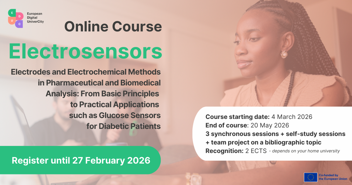 Si informa che il corso EDUC focalizzato su elettrodi, sensori e biosensori per applicazioni farmaceutiche e biomediche, si terrà tra il 4 Marzo e il 20 Maggio 2026 in modalità blended (autoapprendimento online sulla piattaforma Moodle e lezioni sincrone/asincrone online).