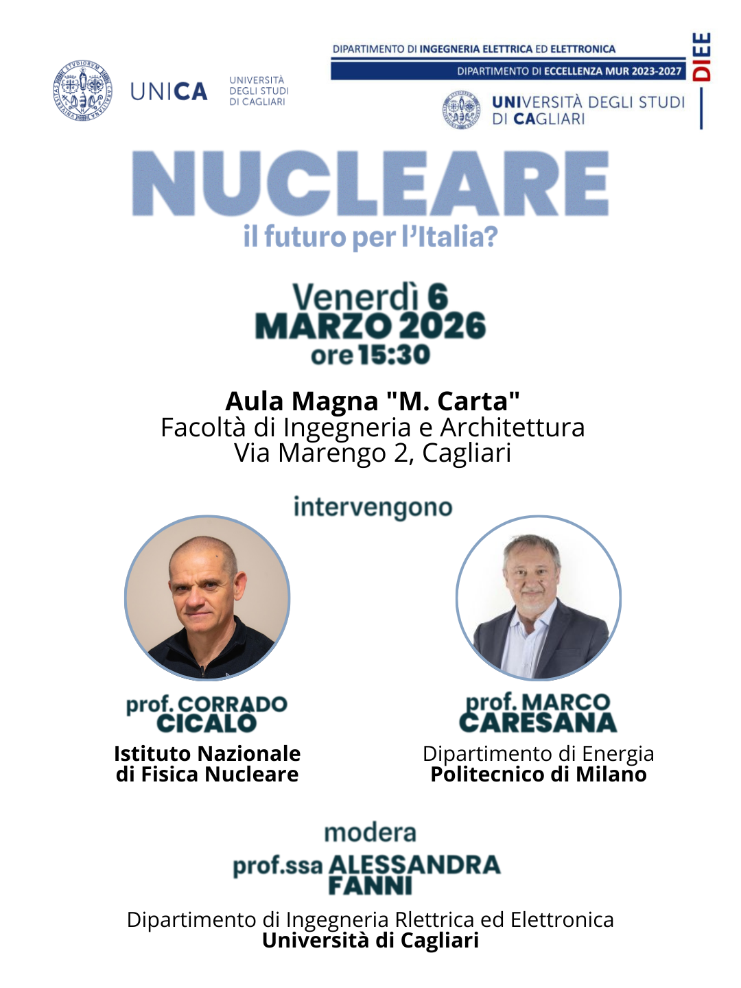 Venerdì 6 marzo 2026, alle ore 15:30 nell’Aula Magna M. Carta della Facoltà di Ingegneria e Architettura si svolgerà un incontro sul futuro dell’energia nucleare in Italia. Parteciperanno all’incontro due esperti del settore, il Prof. Corrado Cicalò (INFN di Cagliari) e il Prof. Marco Caresana (Dipartimento di Energia, PoliMi), con la moderazione della Prof.ssa Alessandra Fanni (DIEE).