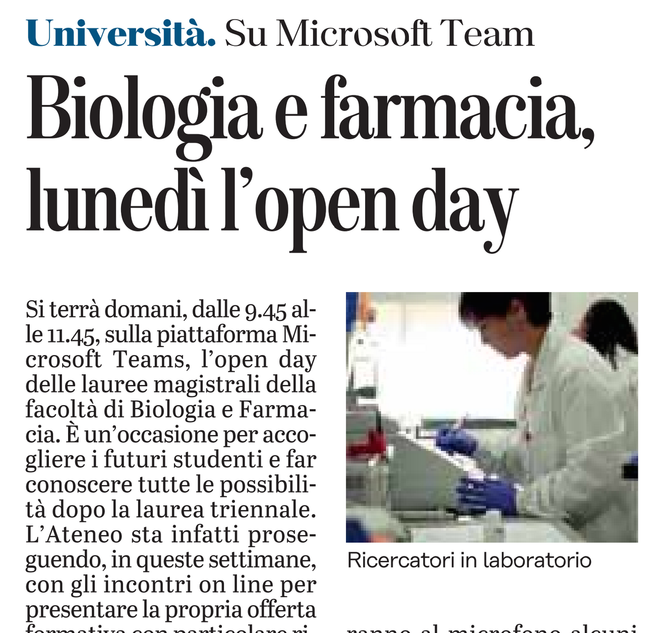 Si terrà domani, dalle 9.45 alle 11.45, sulla piattaforma Microsoft Teams, l'open day delle lauree magistrali della facoltà di Biologia e Farmacia. È un'occasione per accogliere i futuri studenti e far conoscere tutte le possibilità dopo la laurea triennale. L'Ateneo sta infatti proseguendo, in queste settimane, con gli incontri on line per presentare la propria offerta formativa con particolare riguardo alle lauree magistrali.
