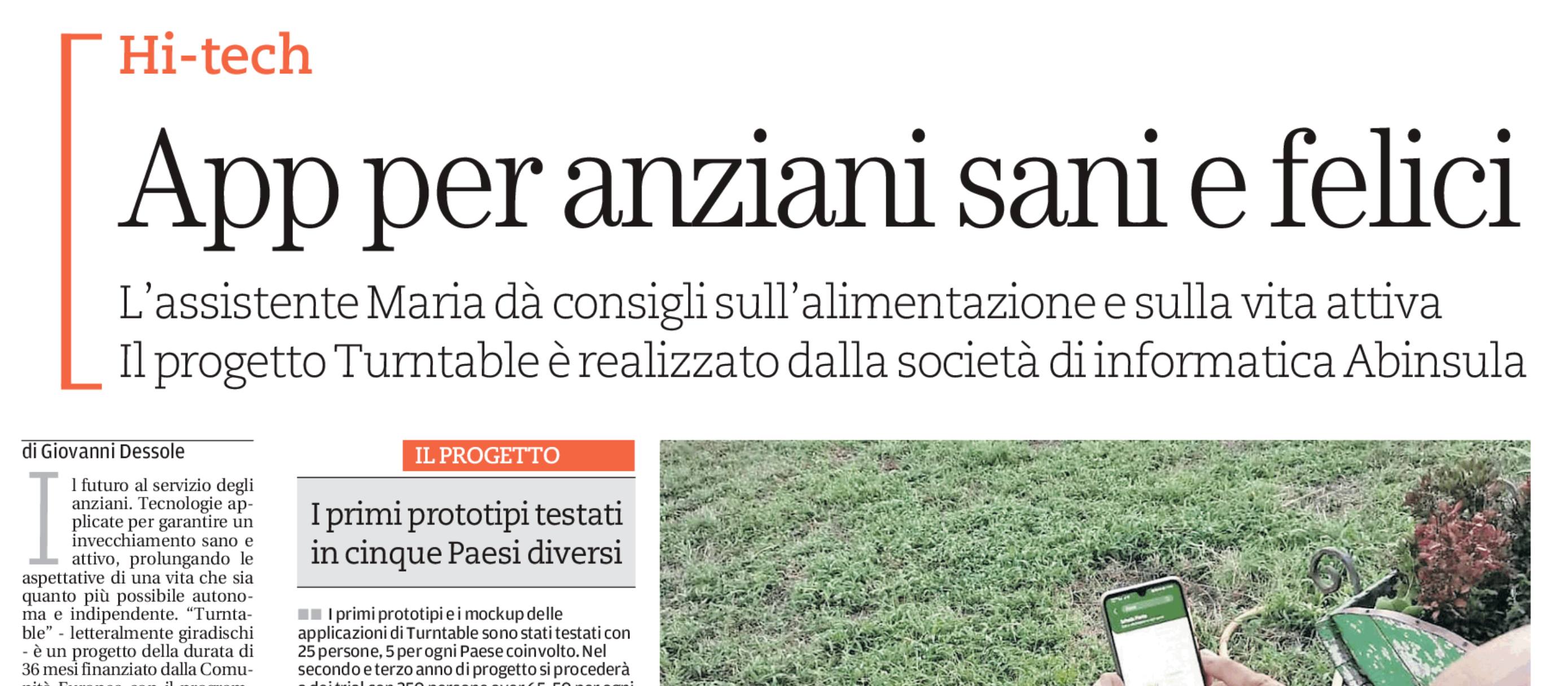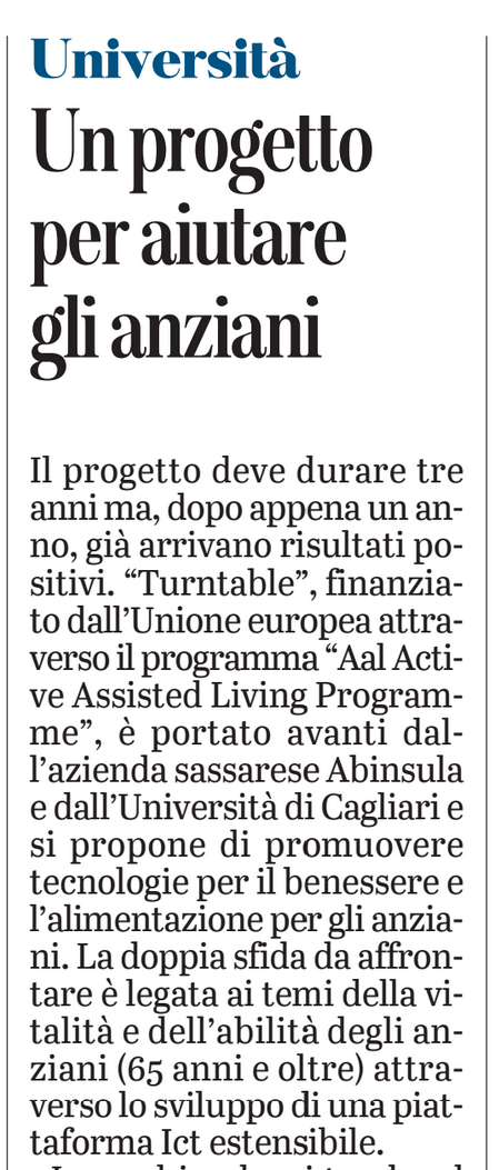 Il progetto deve durare tre anni ma, dopo appena un anno, già arrivano risultati positivi. “Turntable”, finanziato dall'Unione europea attraverso il programma “Aal Active Assisted Living Programme”, è portato avanti dall'azienda sassarese Abinsula e dall'Università di Cagliari e si propone di promuovere tecnologie per il benessere e l'alimentazione per gli anziani. La doppia sfida da affrontare è legata ai temi della vitalità e dell'abilità degli anziani (65 anni e oltre) attraverso lo sviluppo di una piattaforma Ict estensibile.