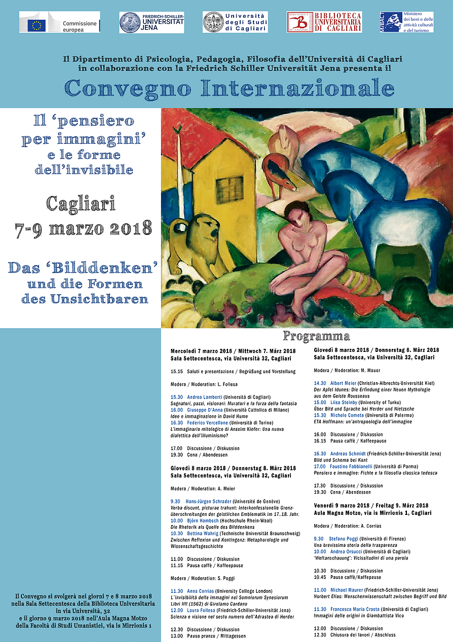 Avrà inizio mercoledì 7 marzo il convegno internazionale dal titolo “Il pensiero per immagini e le forme dell'invisibile” (Das Bilddenken und die Gestalten des Unsichtbaren), organizzato dall’Università degli Studi di Cagliari e dalla Friedrich-Schiller-Universität di Jena (Germania). Il 7 e l’8 marzo i lavori si svolgeranno nella Sala Settecentesca della Biblioteca Universitaria, mentre il 9 marzo si sposteranno nell’Aula Magna della Facoltà di Studi Umanistici dell’Università degli Studi di Cagliari.
