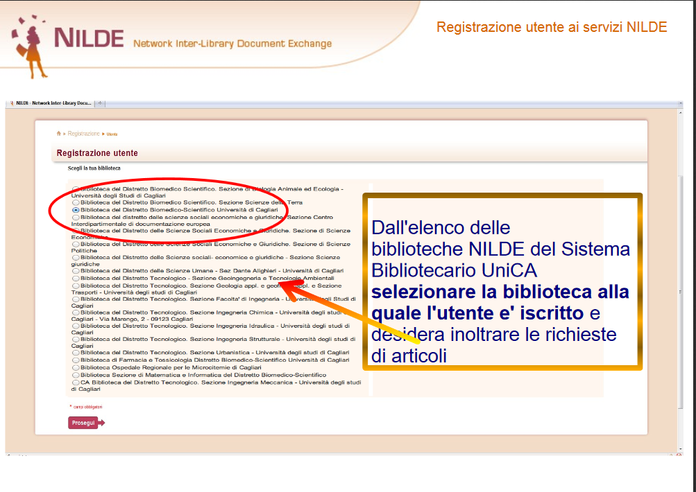 Se l'utente era già registrato ai servizi Nilde-Utenti presso la propria biblioteca può prodedere alla richiesta di document delivery. Altrimenti procedere alla registrazione.
