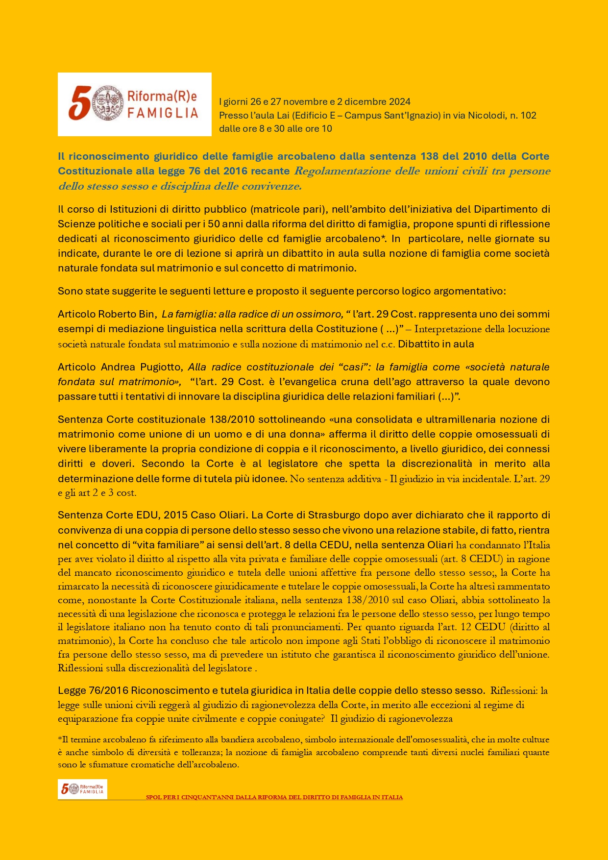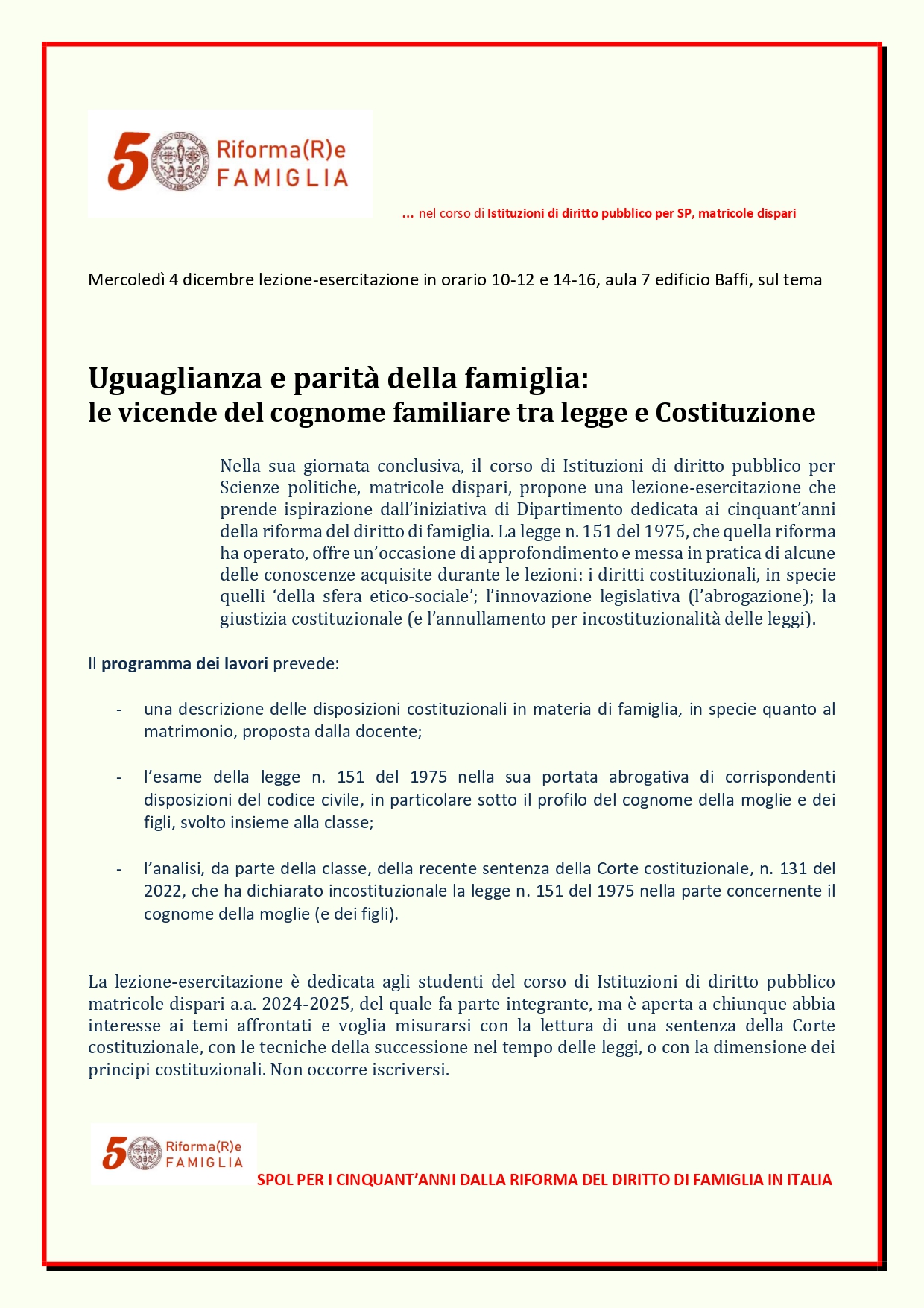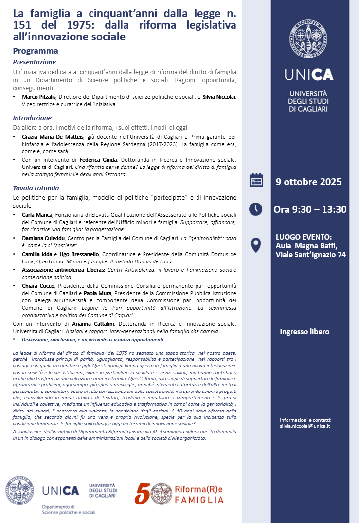 - Seminario: "La famiglia a cinquant’anni dalla legge n. 151 del 1975: dalla riforma legislativa all’innovazione sociale"