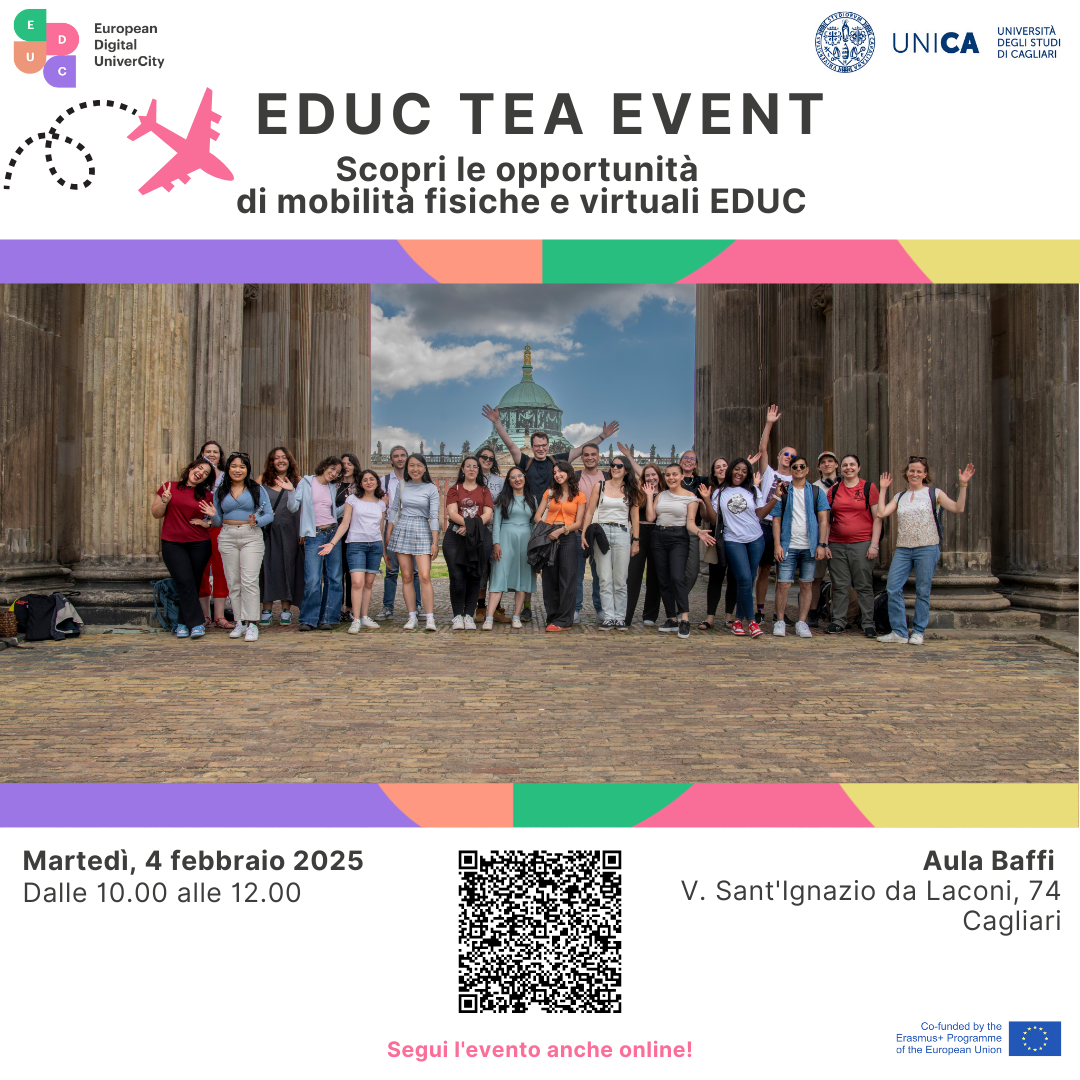 Il 4 febbraio, a partire dalle ore 10.00, sarà possibile incontrare i membri del Team EDUC di UniCa presso l’Aula Baffi, in Via Sant'Ignazio da Laconi 74, a Cagliari, o seguire l’evento online tramite la piattaforma Teams.