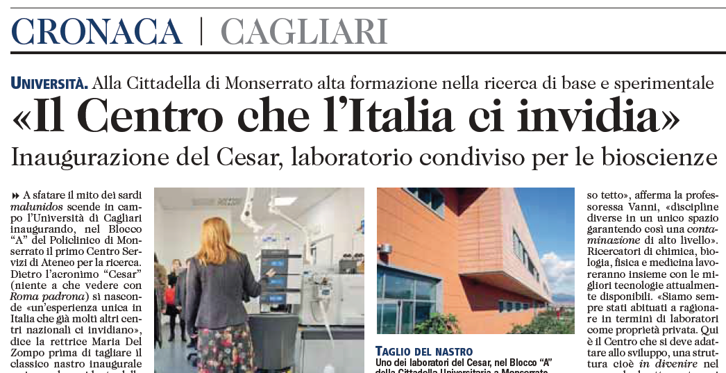 A sfatare il mito dei sardi malunidos scende in campo l'Università di Cagliari inaugurando, nel Blocco “A” del Policlinico di Monserrato il primo Centro Servizi di Ateneo per la ricerca. Dietro l'acronimo “Cesar” (niente a che vedere con Roma padrona ) si nasconde «un'esperienza unica in Italia che già molti altri centri nazionali ci invidiano», dice la rettrice Maria Del Zompo prima di tagliare il classico nastro inaugurale assieme al presidente della Regione Francesco Pigliaru e alla direttrice del Centro Roberta Vanni.