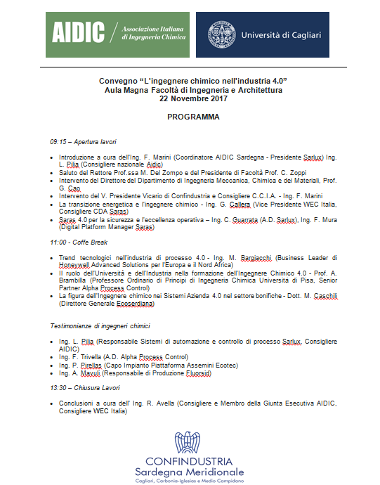 I lavori, introdotti dall’ingegnere Francesco Marini, coordinatore dell’AIDIC Sardegna e presidente della Sarlux, saranno incentrati sugli sviluppi dell'industria chimica nei sistemi azienda 4.0. Sono previsti i saluti del Rettore dell’Università di Cagliari Maria Del Zompo e del professor Giacomo Cao, direttore del Dipartimento di Ingegneria chimica e meccanica.