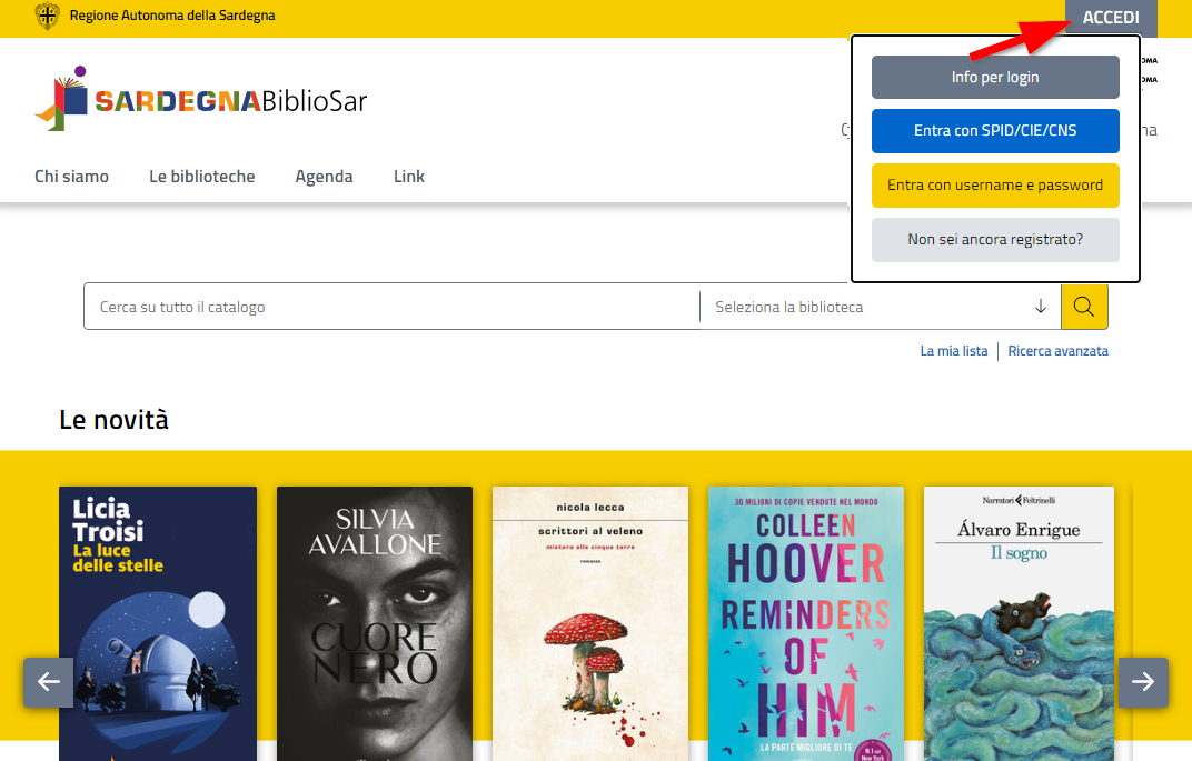 Clicca su Accedi (in alto a destra nella pagina di BiblioSar) e vai alle icone per l'accesso con identità digitale. Scegli il tipo di accesso e il tuo Gestore di Identità Digitale (Identity Provider).