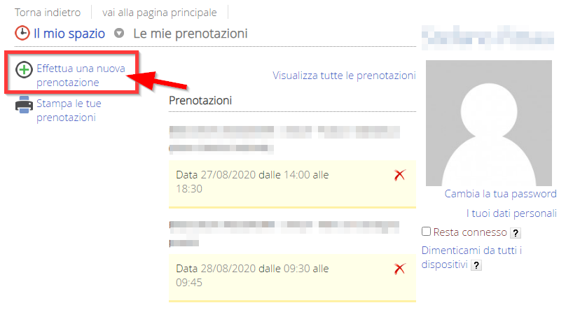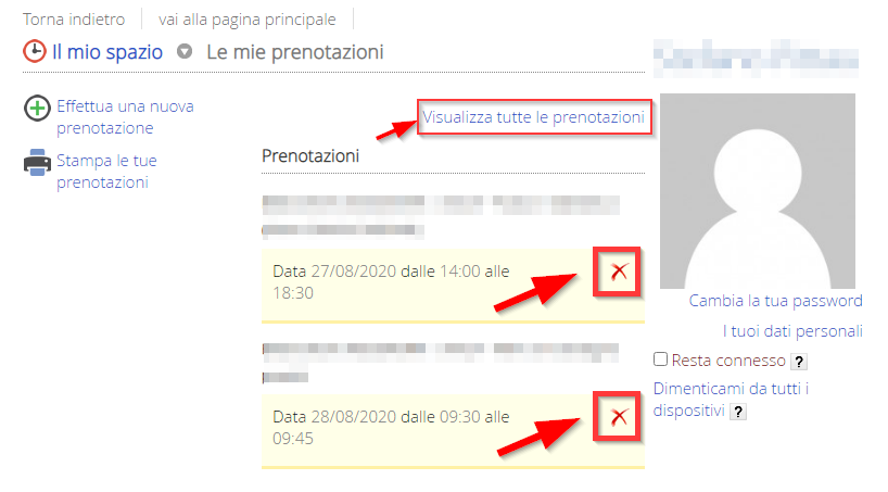 Dallo stessa schermata si potranno cancellare le proprie prenotazioni attivando il pulsante rosso con la “X” e si potranno visualizzare le prenotazioni non più attive cliccando sulla voce “Visualizza tutte le prenotazioni”.