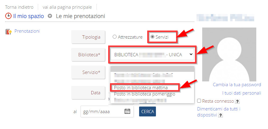 Nella schermata di prenotazione si dovrà selezionare la voce “Servizi”, quindi la biblioteca di interesse nel menu a tendina “Biblioteche” e l’eventuale specifica sala o fascia oraria in cui si vuole riservare un posto.