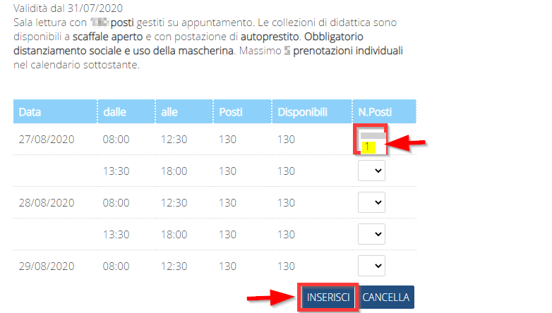 Si visualizzerà il dato aggiornato dei posti al momento disponibili e le informazioni relative alla sala della biblioteca.