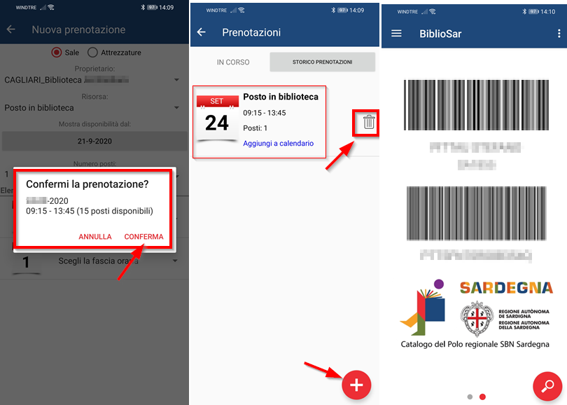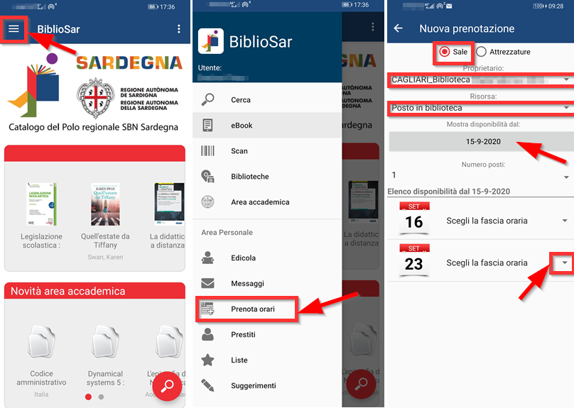 Dal pulsante in alto a sinistra si visualizza il menù e si sceglie l'opzione "Prenota orari". Per aggiungere una prenotazione, cliccare sull’icona "+" su sfondo rosso presente in basso a destra, quindi selezionare Sale, la Biblioteca e il Servizio.