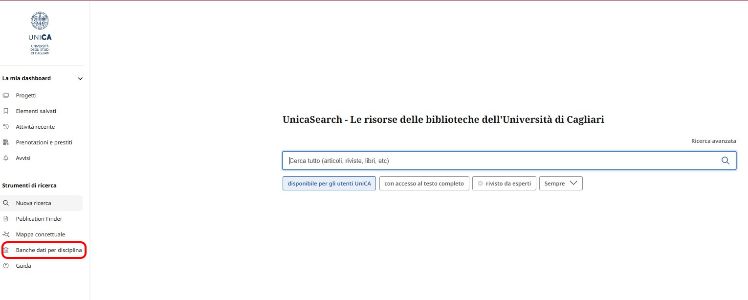 L'elenco delle banche dati può essere visualizzato cliccando sui link qui sotto, oppure cliccando sulla sezione "Banche dati per disciplina" presente nel menù a sinistra su UniCASearch (vedi immagine).