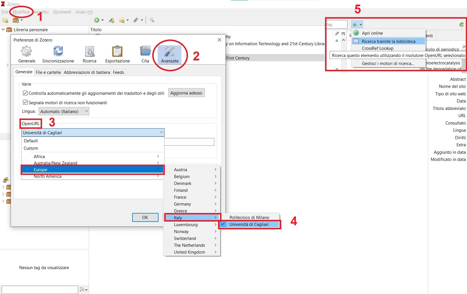 Per collegare Zotero al motore di ricerca bibliografico (link resolver) di Ateneo UniCASearch, andare in Modifica > Preferenze > Avanzate > OpenURL e selezionare dall'elenco Europe > Italy > Università di Cagliari.