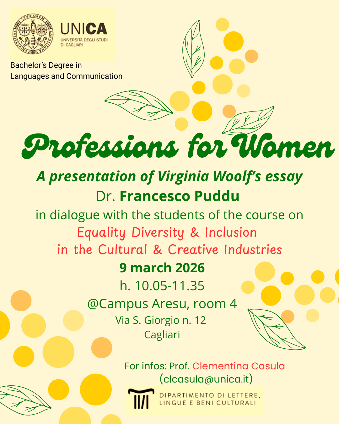 Monday, May 9, 2026, from 10:05-11:35 a.m., in room 4 on the I floor of the main building of the Aresu Campus (Via S. Giorgio), on the occasion of International Women's Day 2026, an English-language seminar entitled "Professions for Women" will be held as part of the Equality, Diversity and Inclusion in the Cultural and Creative Industries course (Bachelor's degree in Languages and Communication). Starting with the presentation of Virginia Woolf's essay by Dr. Francesco Puddu, the students of the course will discuss the topic with the speaker. The course teacher, Prof. Clementina Casula, will chair the seminar (for infos: clcasula@unica.it). The entrance is open to interested UniCa students, within the capacity limits permitted by the classroom (a poster is attached).
