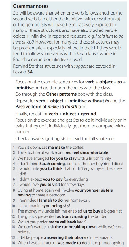 Here is the key to the exercises to verb patterns (verb + object + infinitive/infinitive without 'to'/gerund) for the grammar bank 6A.