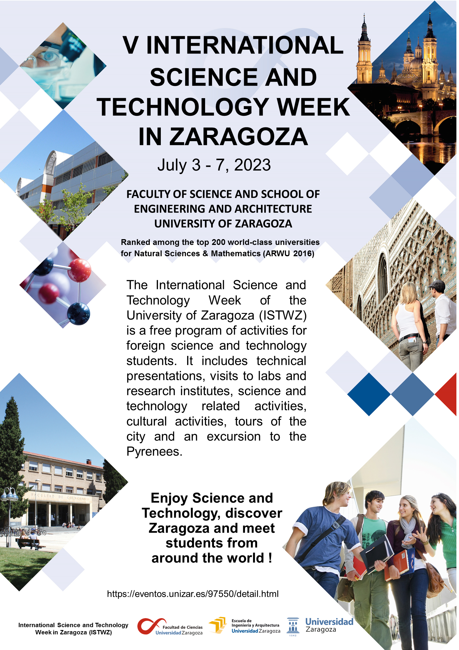 The Faculty of Science and the School of Engineering and Architecture of the University of Zaragoza are organizing the V International Science and Technology Week (ISTWZ). It is a free program of activities aimed at inviting foreign science and technology students and exchange coordinators to get acquainted with the Faculty of Science and the School of Engineering and Architecture, as well as the university and the city of Zaragoza. The V ISTWZ will be held at the University of Zaragoza, from 3rd to 7th, July 2023. Events include technical presentations, visits to labs and research institutes, meetings with researchers, other science and technology related activities, cultural activities, tours of the city and an excursion to the Pyrenees. Registration and participation is free, and it includes accommodation for students, lunch and all activities related to the event. This will be the fifth edition of ISTWZ, after the great success of the 2017, 2018, 2019 and 2022 editions.