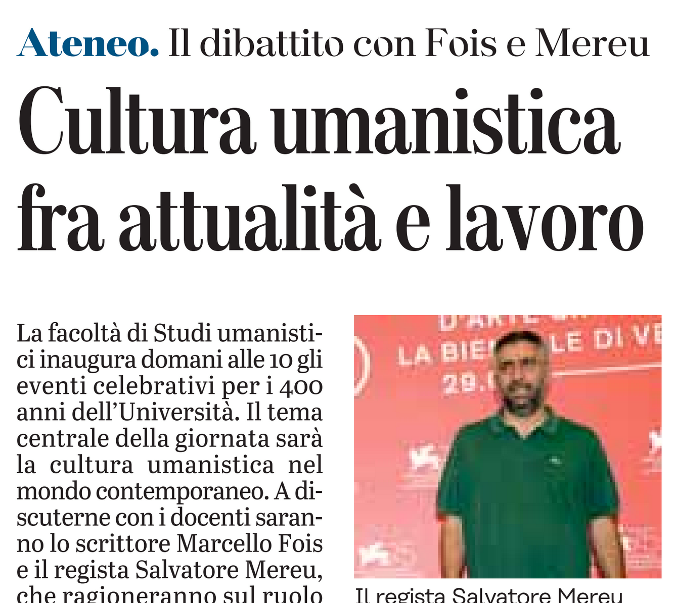 La facoltà di Studi umanistici inaugura domani alle 10 gli eventi celebrativi per i 400 anni dell'Università. Il tema centrale della giornata sarà la cultura umanistica nel mondo contemporaneo. A discuterne con i docenti saranno lo scrittore Marcello Fois e il regista Salvatore Mereu, che ragioneranno sul ruolo della formazione umanistica e sulle opportunità che offre nel contesto sociale in cui viviamo.