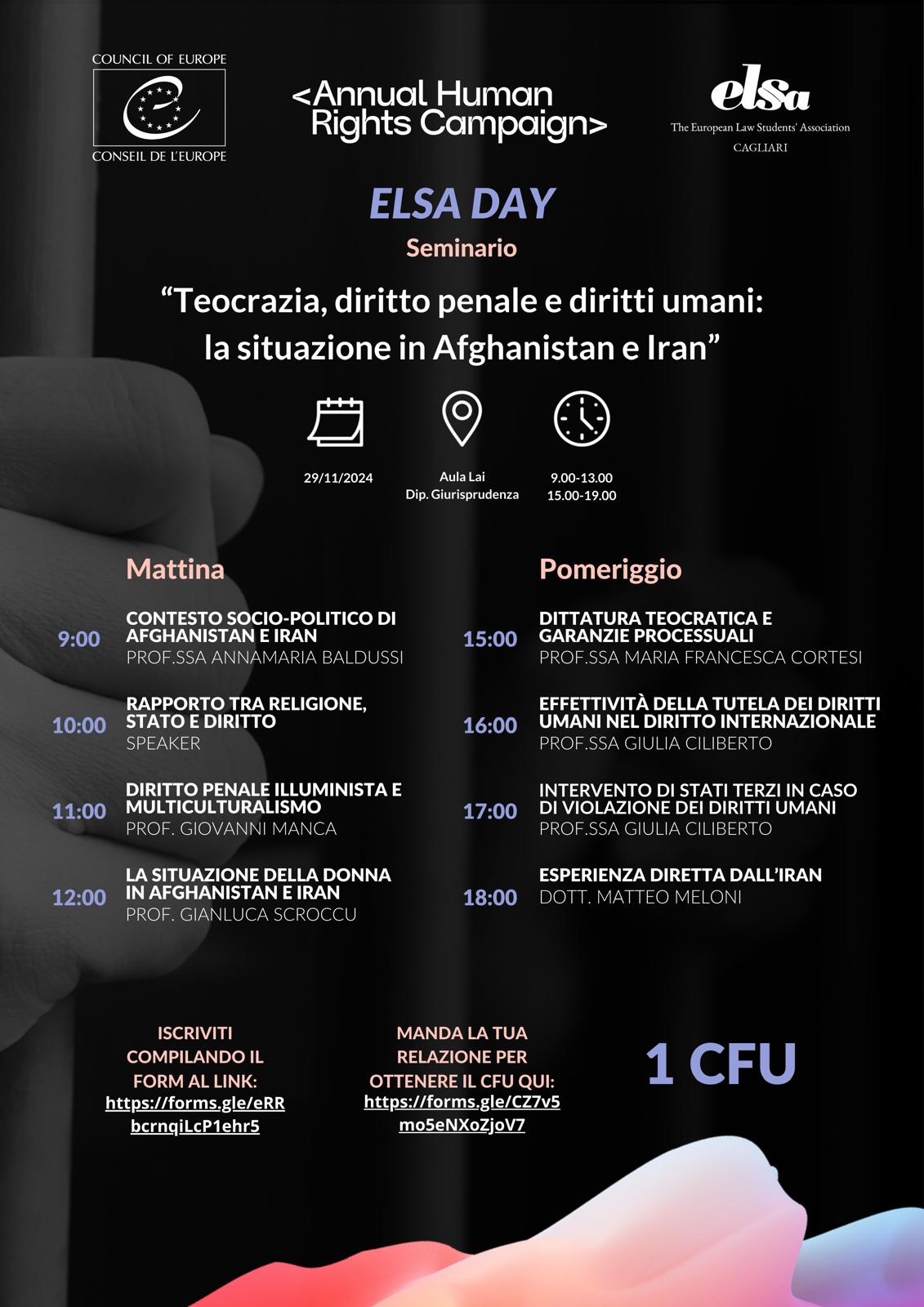 Si avvisano gli studenti che l’attribuzione di cfu per il seminario "Teocrazia, diritto penale e diritti umani: la situazione in Afghanistan e Iran”, di cui si pubblica di seguito la scheda analitica con tutte le informazioni e le modalità di iscrizione, avverrà alla prossima riunione utile.
