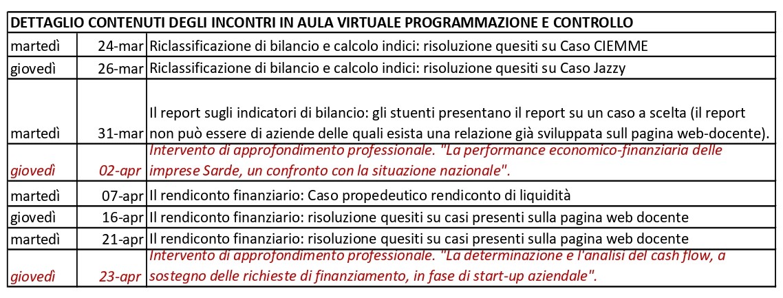 martedì inizieranno gli incontri in aula virtuale per l’insegnamento di Programmazione e Controllo. A seguito dell’emergenza sanitaria non esistono più i partizionamenti, ma un unico corso, che potremmo immaginare tenuto da tre docenti. A partire da martedì, quindi, il sottoscritto, la Dott.ssa Macchia e la Dott.ssa Mulas si alterneranno in aula virtuale tenendo interventi rivolti a tutti gli studenti che devono sostenere l’esame, a prescindere dal finale di matricola. I contenuti dell’esame di Programmazione e Controllo sono interamente coperti dalle video-lezioni presenti sulla piattaforma, che sostituiscono le lezioni in presenza fisica. L’aula virtuale verrà pertanto utilizzata per chiarire i passaggi più ostici delle esercitazioni pre-caricate (testo e soluzione) sulla pagina web del corso 1 e per fornire momenti di approfondimento professionale. In questo avviso trovate un calendario di massima del programma che seguiremo.