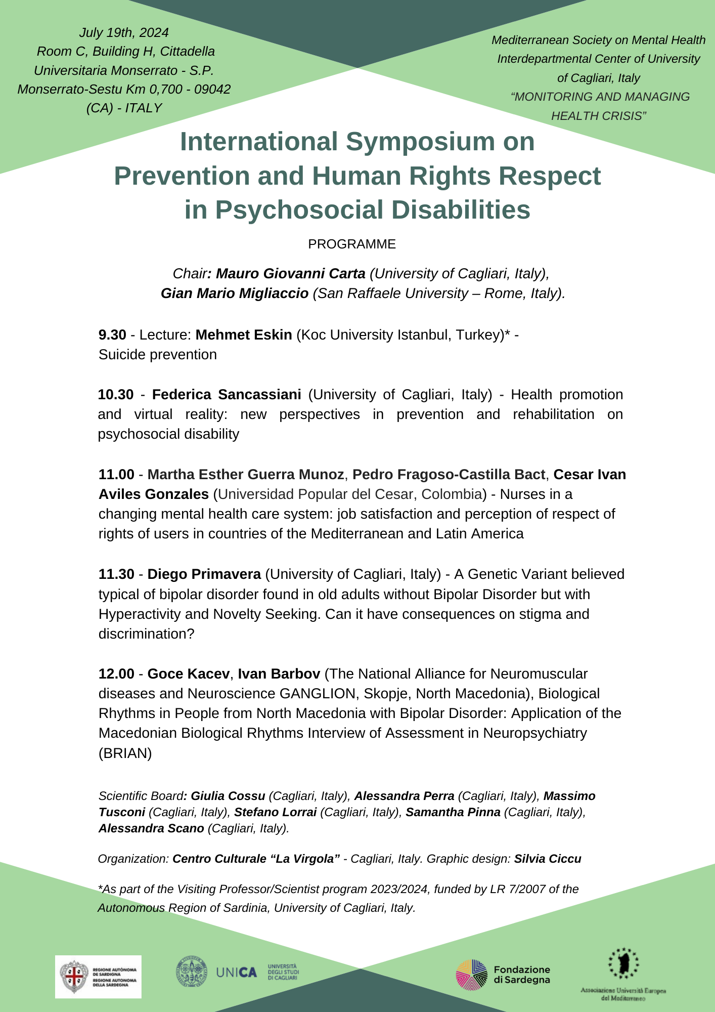 Si invitano gli studenti interessati a partecipare all'International Symposium on Prevention and Human Rights Respect in Psychosocial Disabilities che si terrà in data 19 Luglio 2024