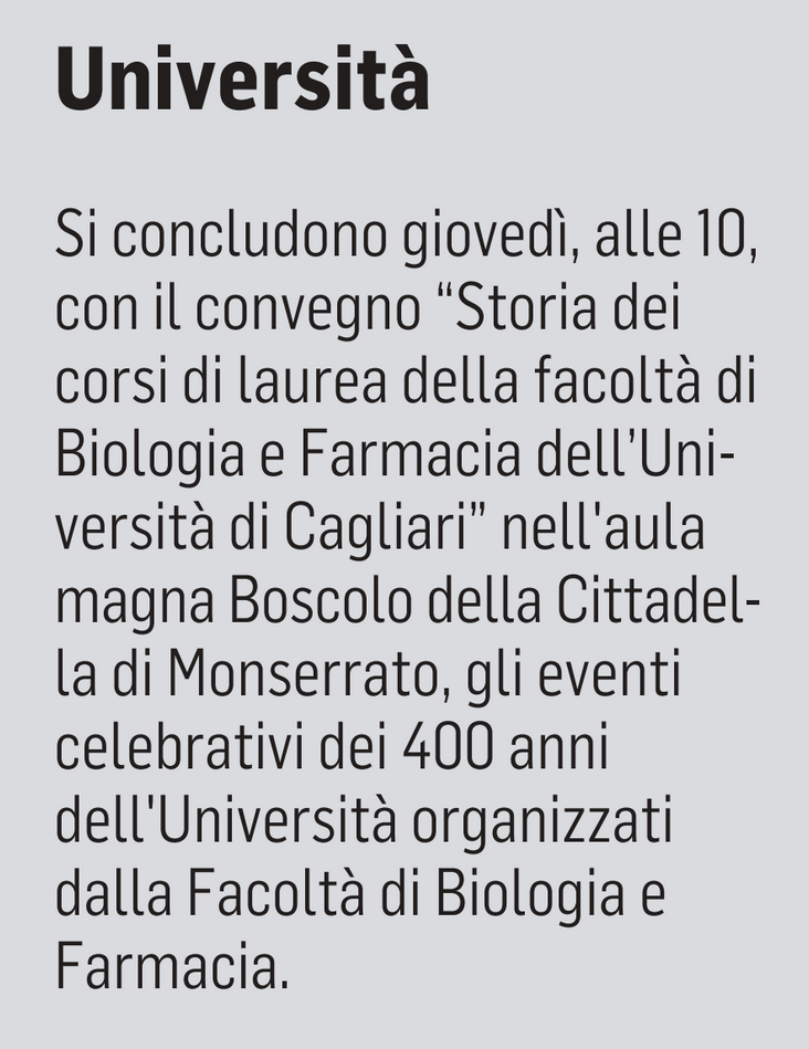 Si concludono giovedì, alle 10, con il convegno "Storia dei corsi di laurea della facoltà di Biologia e Farmacia dell'Università di Cagliari" nell'aula magna Boscolo della Cittadella di Monserrato, gli eventi celebrativi dei 400 anni dell'Università organizzati dalla Facoltà di Biologia e Farmacia.