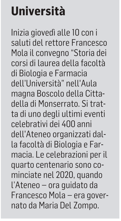 Inizia giovedì alle 10 con i saluti del rettore Francesco Mola il convegno "Storia dei corsi di laurea della facoltà di Biologia e Farmacia dell'Università" nell'Aula magna Boscolo della Cittadella di Monserrato. Si tratta di uno degli ultimi eventi celebrativi dei 400 anni dell'Ateneo organizzati dalla facoltà di Biologia e Farmacia. Le celebrazioni per il quarto centenario sono cominciate nel 2020, quando l'Ateneo – ora guidato da Francesco Mola – era governato da Maria Del Zompo.