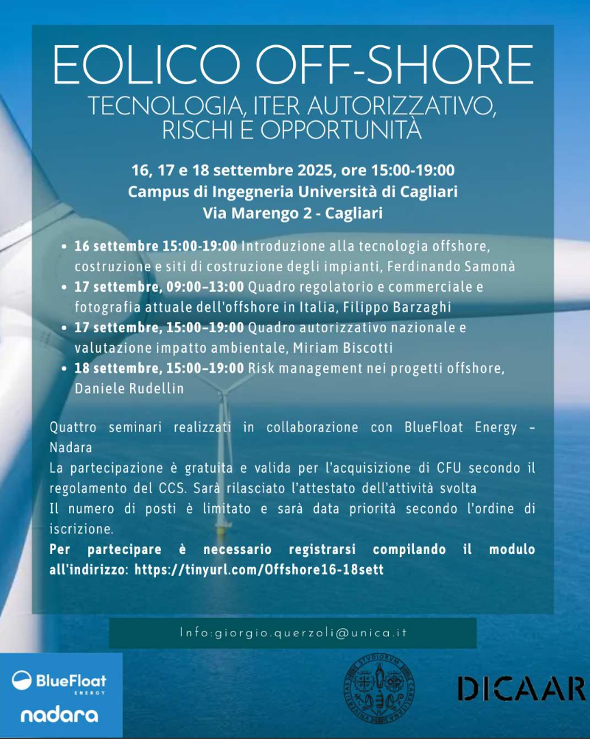 Nel mese di settembre 2025 si svolgerà il ciclo di seminari "Eolico offshore: tecnologia, iter autorizzativo alla realizzazione, rischi e opportunità". Si riporta di seguito il calendario dei seminari.