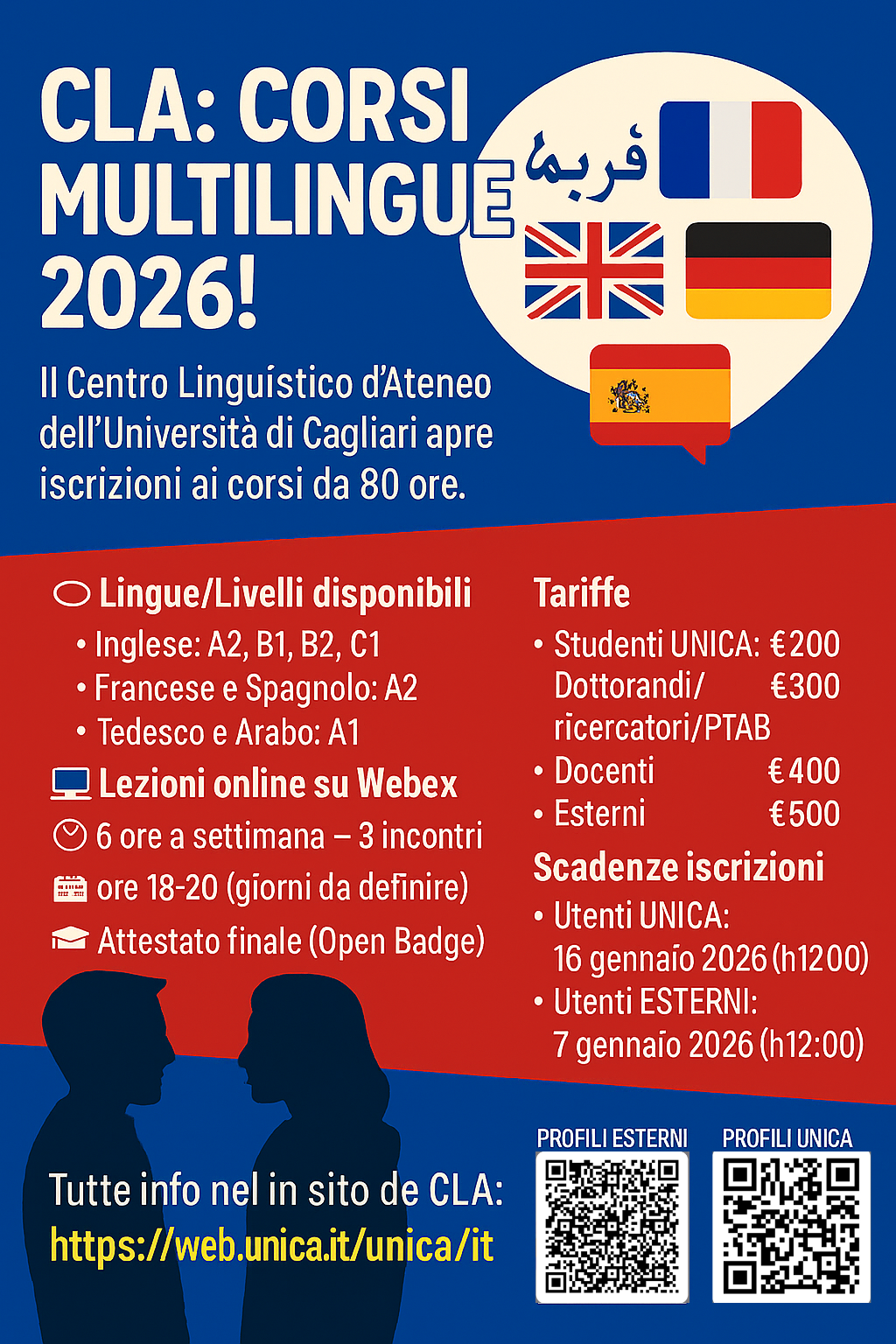 Tutte le info sono contenute nell'avviso allegato e gli aggiornamenti saranno pubblicati nel sito del CLA: https://web.unica.it/unica/it/cla.page