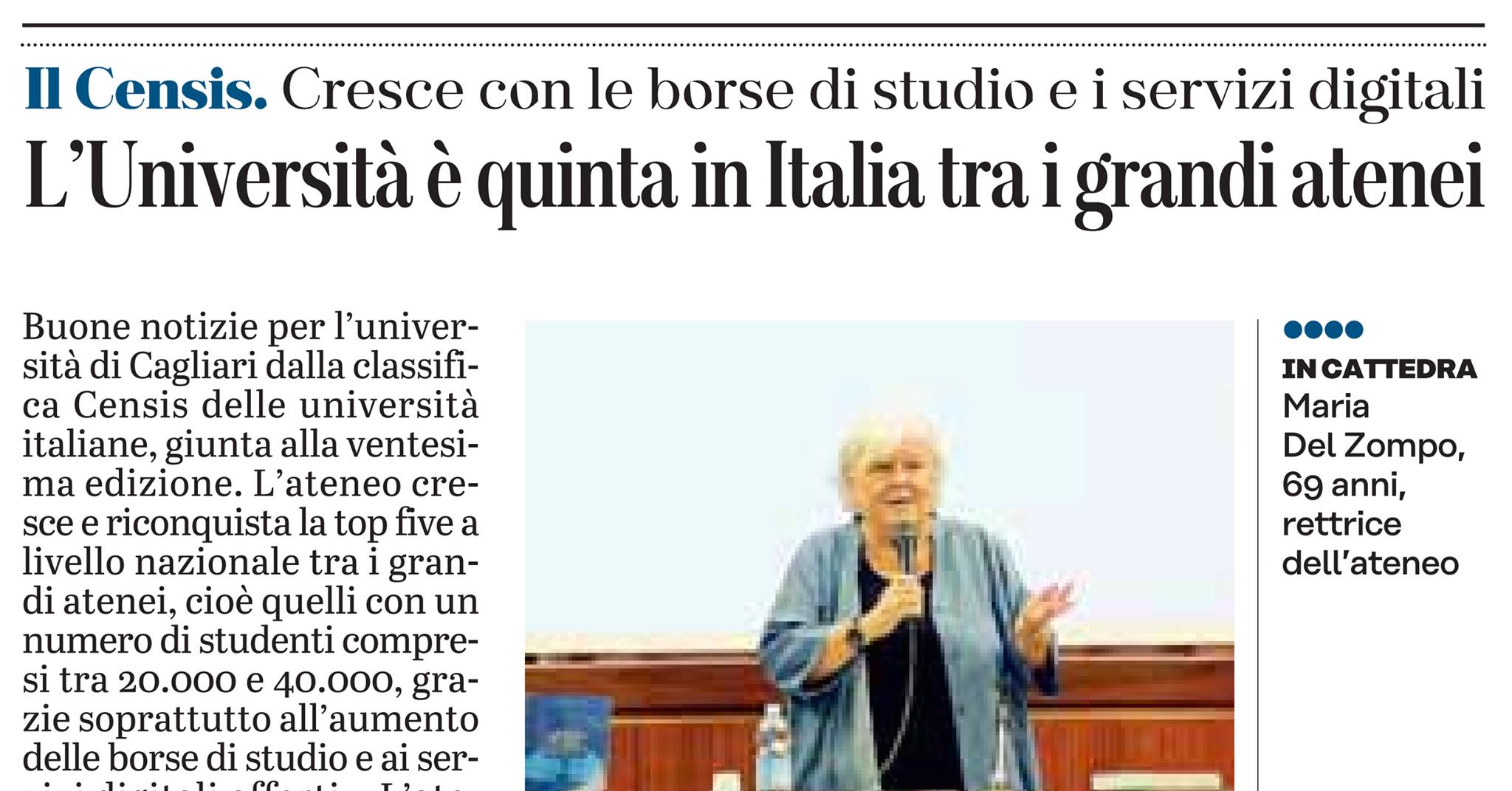 Buone notizie per l'università di Cagliari dalla classifica Censis delle università italiane, giunta alla ventesima edizione. L'ateneo cresce e riconquista la top five a livello nazionale tra i grandi atenei, cioè quelli con un numero di studenti compresi tra 20.000 e 40.000, grazie soprattutto all'aumento delle borse di studio e ai servizi digitali offerti. «L'ateneo cagliaritano continua il suo percorso di crescita costante nel tempo», afferma il rettore Maria Del Zompo, «e mantiene alto il suo valore nonostante i suoi competitor siano tutti atenei di altissimo profilo. Sappiamo che c'è ancora tanto da fare per migliorare ulteriormente. Ma constatare che il lavoro di squadra di tutte le componenti dell'ateneo produce un importante e costante miglioramento su tutti i parametri ci dà ragione sulla politica di crescita attuata dagli organi di governo dell'università a cui va il mio primo ringraziamento. Sono oltremodo contenta che gli studenti che scelgono il nostro ateneo, e le loro famiglie, verifichino la bontà delle loro scelte. L'ateneo continuerà nel suo percorso di innovazione e miglioramento della qualità della didattica e della ricerca, dei servizi offerti e del rapporto con il territorio».