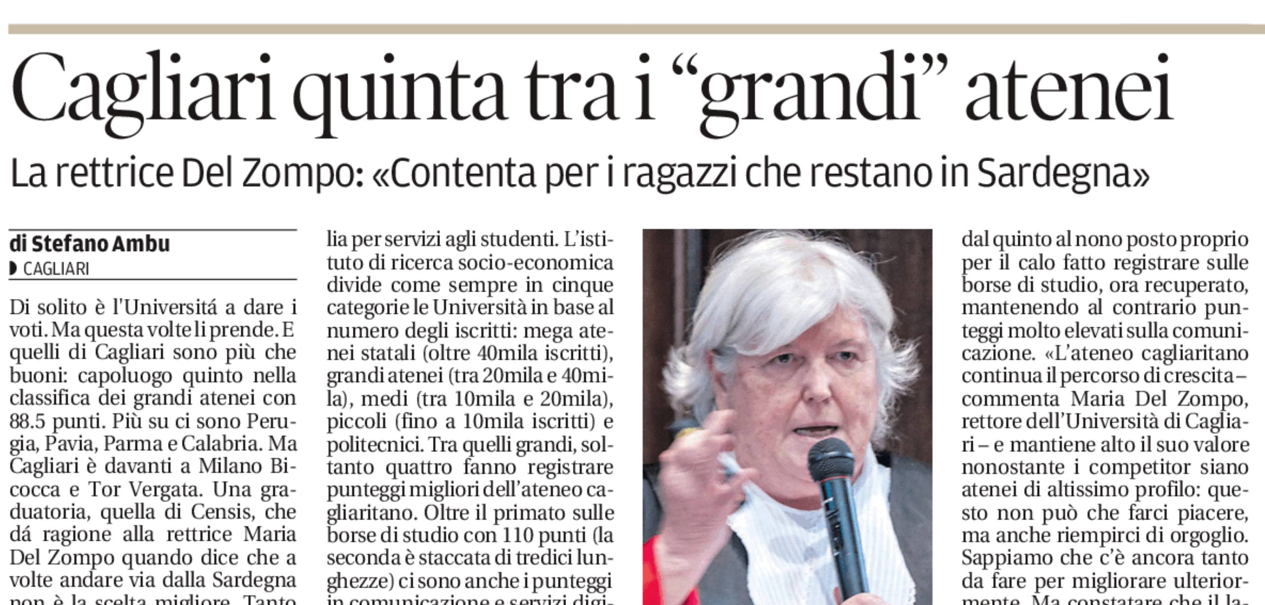 “L’Ateneo cagliaritano continua il suo percorso di crescita costante nel tempo - è il commento di Maria Del Zompo, Rettore dell’Università di Cagliari - e mantiene alto il suo valore nonostante i suoi competitor siano tutti Atenei di altissimo profilo: questo non può che farci piacere, ma anche riempirci di orgoglio. Sappiamo che c’è ancora tanto da fare per migliorare ulteriormente. Ma constatare che il lavoro di squadra di tutte le componenti dell’Ateneo produce un importante e costante miglioramento su tutti i parametri ci rende ragione sulla politica di crescita attuata dagli organi di governo dell’Università di Cagliari a cui va il mio primo ringraziamento. Sono oltremodo contenta che gli studenti che scelgono il nostro Ateneo, e le loro famiglie, verifichino la bontà delle loro scelte! Posso solo dire che il senso di appartenenza è finalmente radicato e che l’Ateneo continuerà nel suo percorso di innovazione e di miglioramento della qualità della didattica e della ricerca, dei servizi offerti e del rapporto con il territorio”.