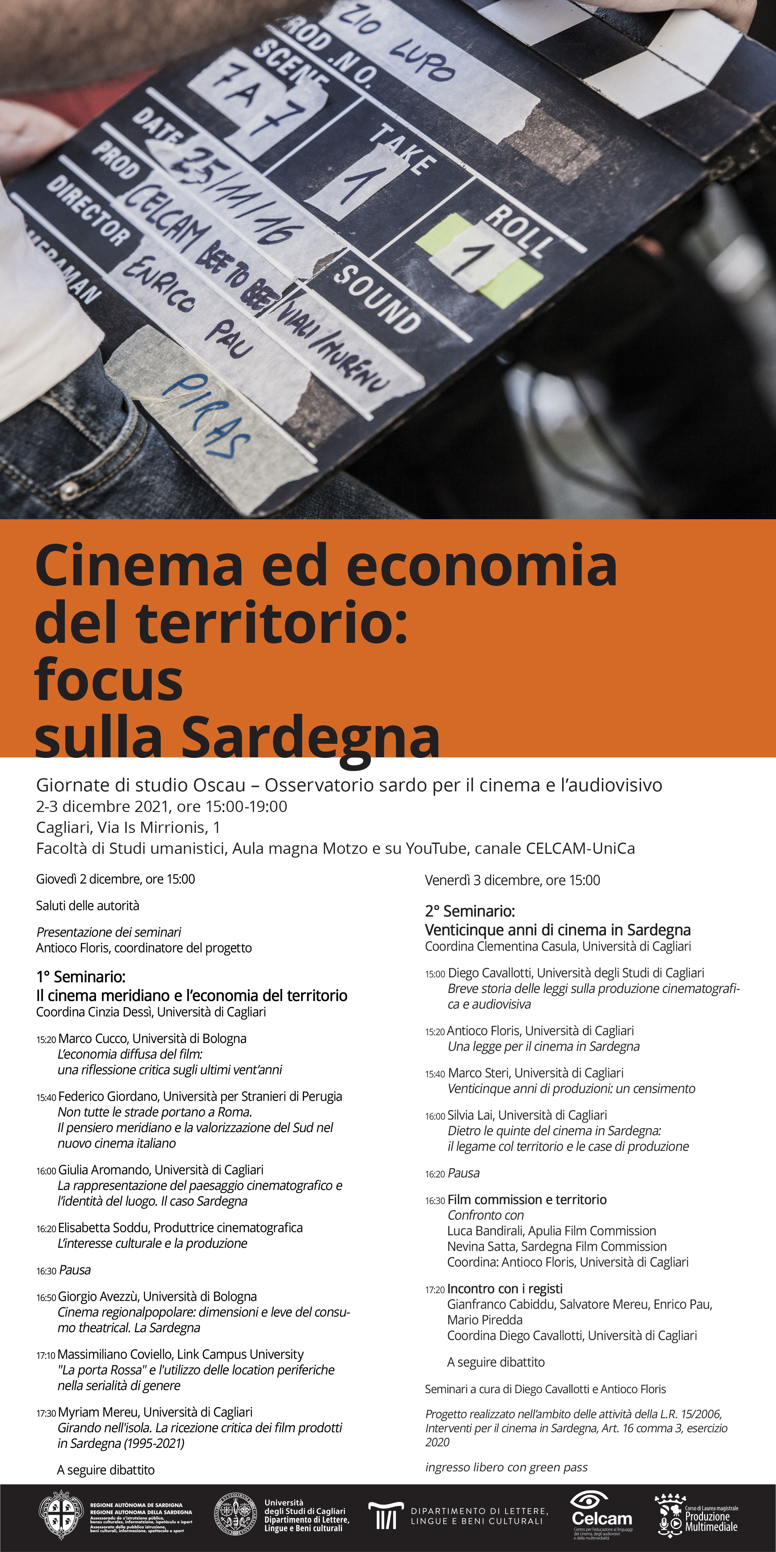 Panel 2: Cinema regionalpopolare: dimensioni e leve del consumo theatrical. La Sardegna, Giorgio Avezzù (Università di Bologna), "La porta Rossa" e l'utilizzo delle location periferiche nella serialità di genere, Massimiliano Coviello (Link Campus University), Girando nell'isola. La ricezione critica dei film prodotti in Sardegna (1995-2021), Myriam Mereu (Università di Cagliari).
