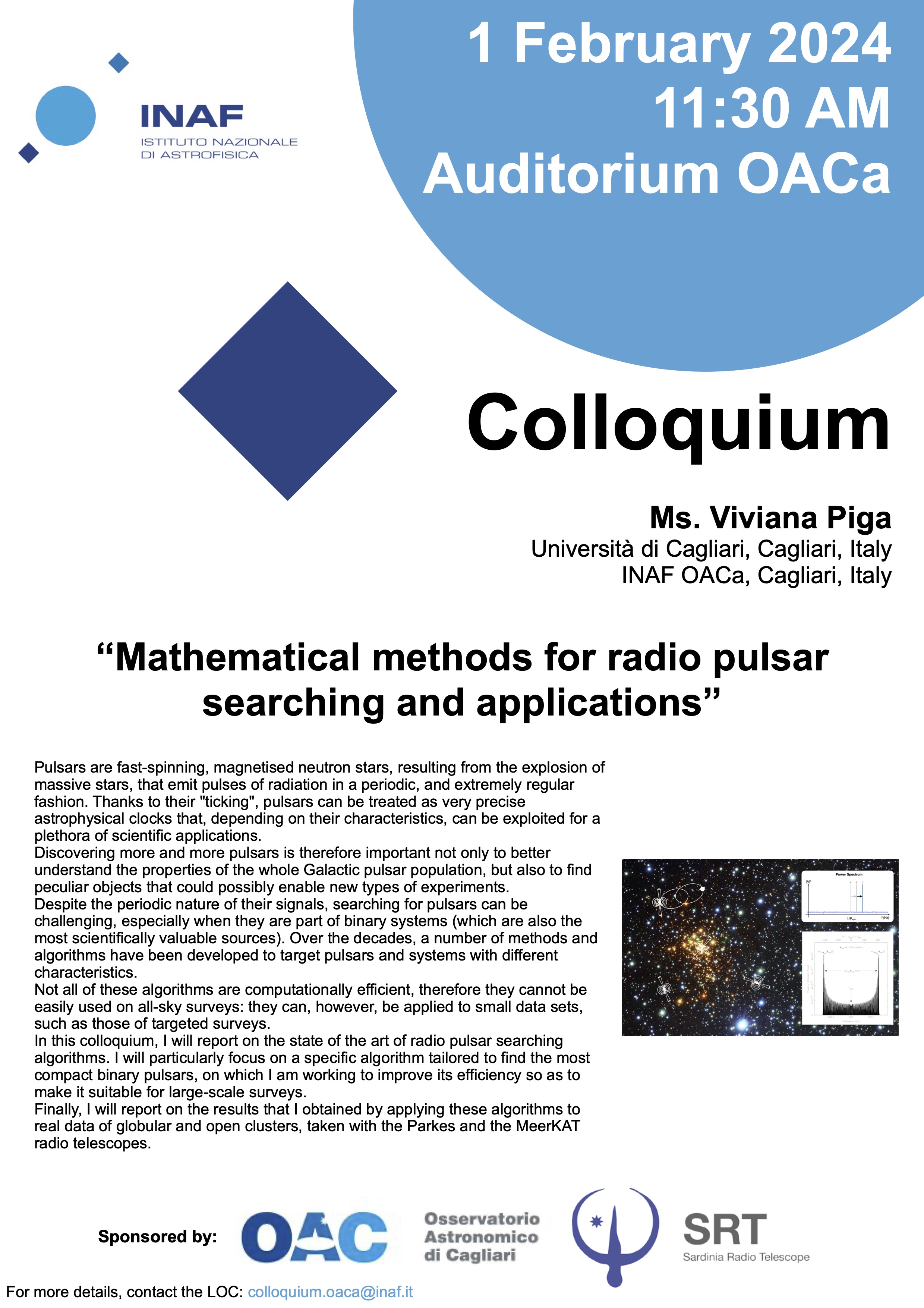 Dear Colleagues, within the series of colloquia organized by the Astronomical Observatory of Cagliari (OACa) monthly, we are pleased to invite you to attend the following seminar: