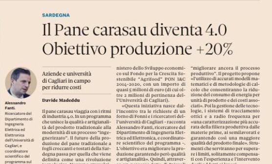 Il merito della prestigiosa vetrina conquistata per l’Università di Cagliari è del progetto IAPC, acronimo che sta per “Ingegnerizzazione e Automazione del Processo di produzione tradizionale del pane Carasau mediante l’utilizzo di tecnologie IOT”, che coinvolge i ricercatori di ben quattro dipartimenti dell’Università di Cagliari e che si avvale di un finanziamento di quasi 5 milioni del Ministero dello Sviluppo economico.