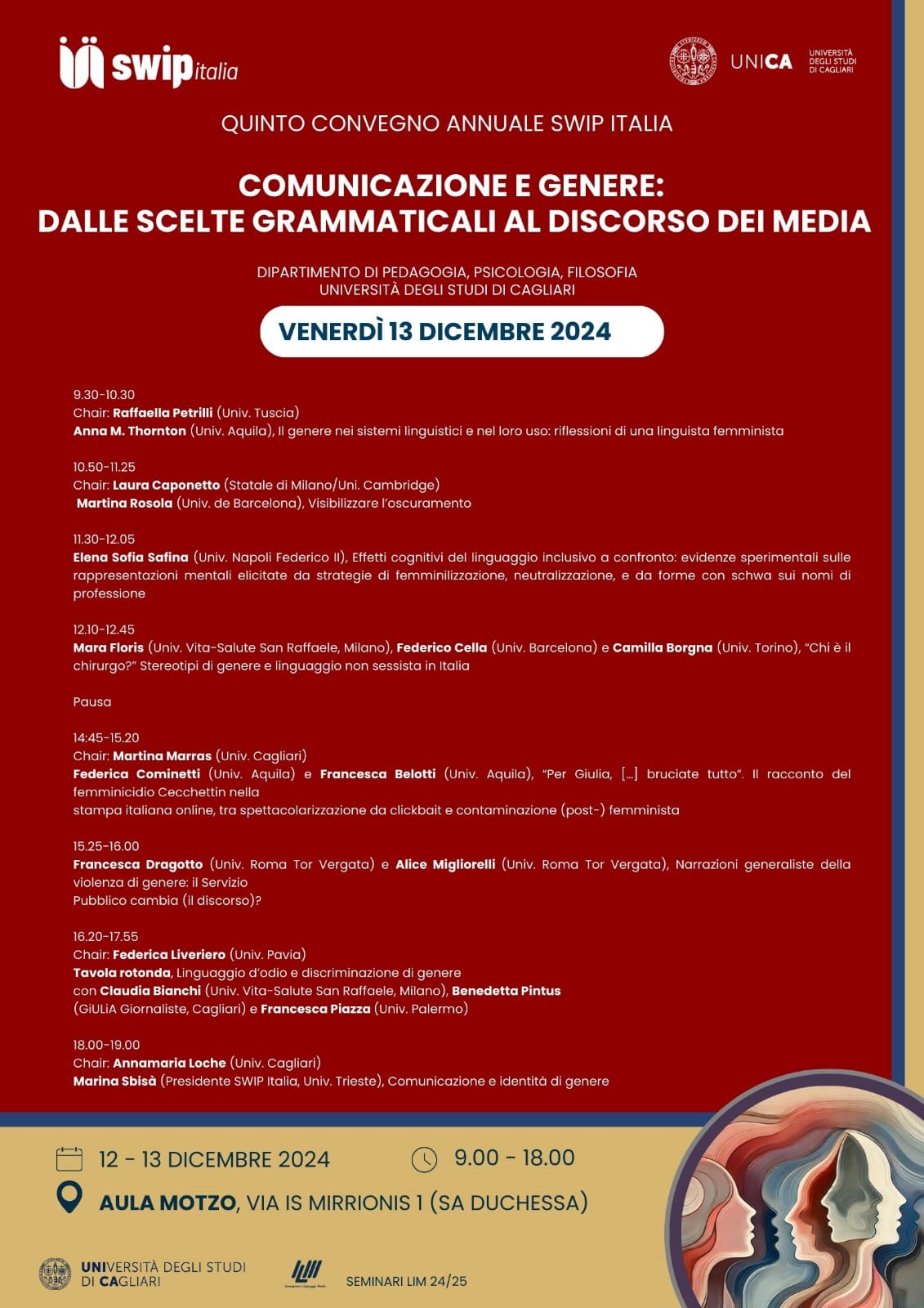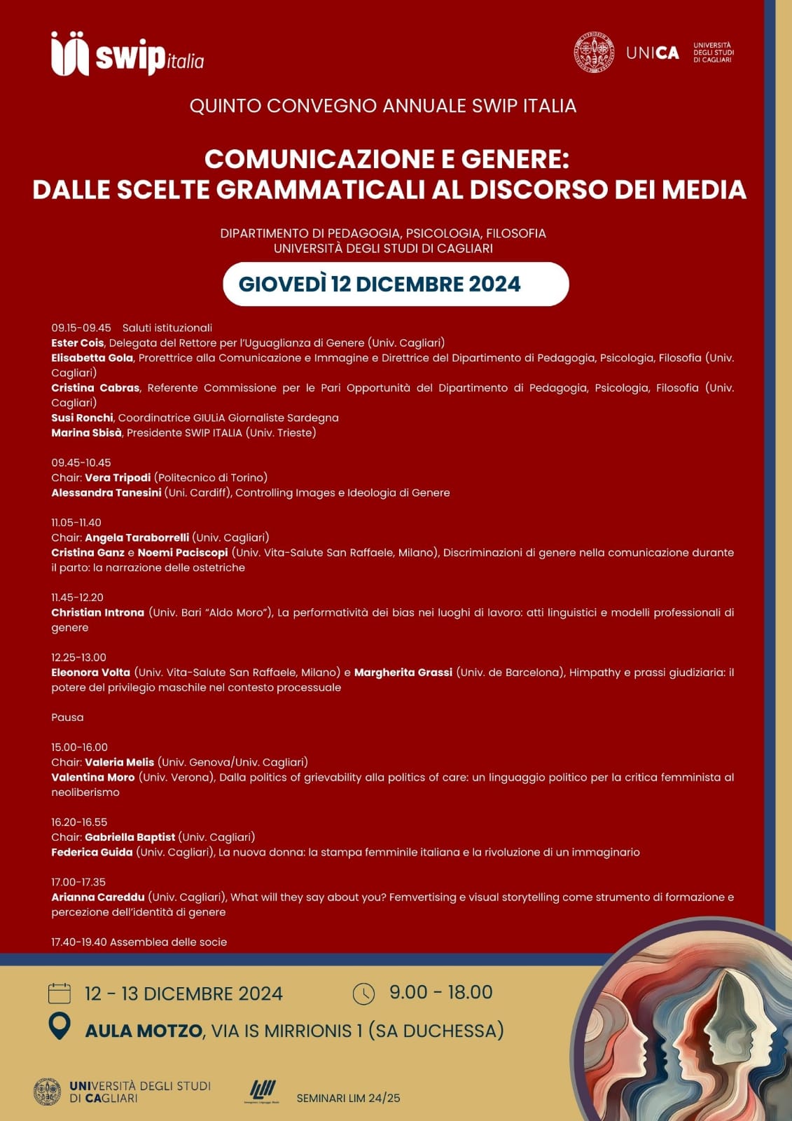 09.15-09.45 Saluti istituzionali: Ester Cois, Delegata del Rettore per l’Uguaglianza di Genere (Università di Cagliari), Elisabetta Gola, Prorettrice alla Comunicazione e Immagine e Direttrice del Dipartimento di Pedagogia, Psicologia, Filosofia (Università di Cagliari), Cristina Cabras, Referente Commissione per le Pari Opportunità del Dipartimento di Pedagogia, Psicologia, Filosofia (Università di Cagliari), Susi Ronchi, Coordinatrice GIULiA Giornaliste Sardegna, Marina Sbisà, Presidente SWIP ITALIA (Università di Trieste)