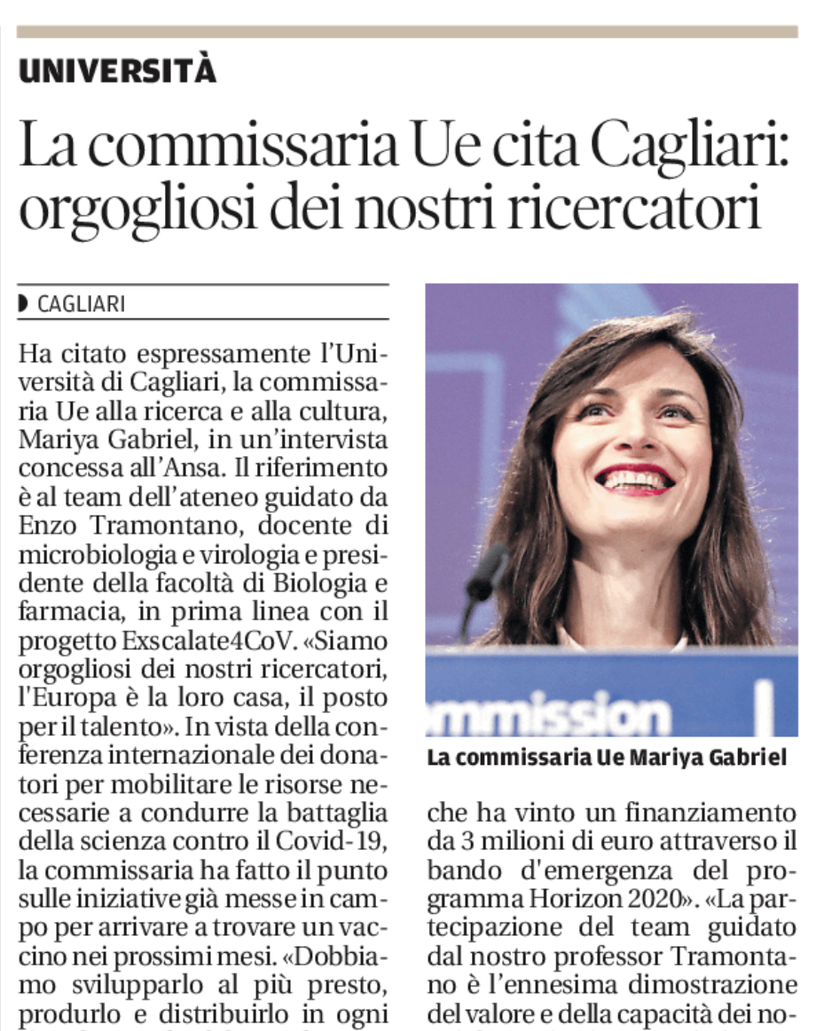 CAGLIARI Ha citato espressamente l'Università di Cagliari, la commissaria Ue alla ricerca e alla cultura, Mariya Gabriel, in un'intervista concessa all'Ansa. Il riferimento è al team dell'ateneo guidato da Enzo Tramontano, docente di microbiologia e virologia e presidente della facoltà di Biologia e farmacia, in prima linea con il progetto Exscalate4CoV.