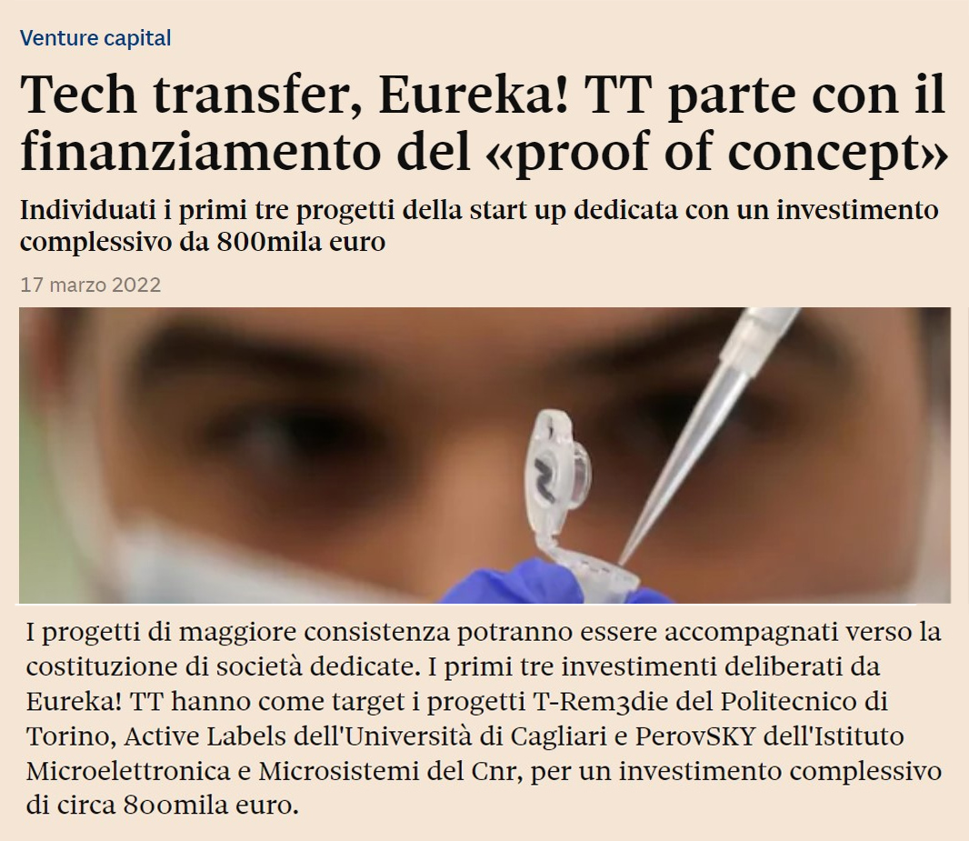 I finanziamenti dei Proof of concept sono ideati e strutturati per permettere la realizzazione di prototipi e la validazione delle tecnologie rispetto ai bisogni del marcato. “Active Label nasce da un team è molto motivato e proattivo. Il piano di sviluppo permetterà in otto mesi di validare una tecnologia proprietaria, molto promettente per il mondo dello smart packaging” sottolinea Anna Amati, partner di Eureka! Con Active Labels dell’Università di Cagliari sono stati già deliberati i finanziamenti (per un totale di ottocentomila euro) per i progetti T-Rem3die (Politecnico di Torino), e PerovSky (Istituto di microelettronica e microsistemi, Cnr).