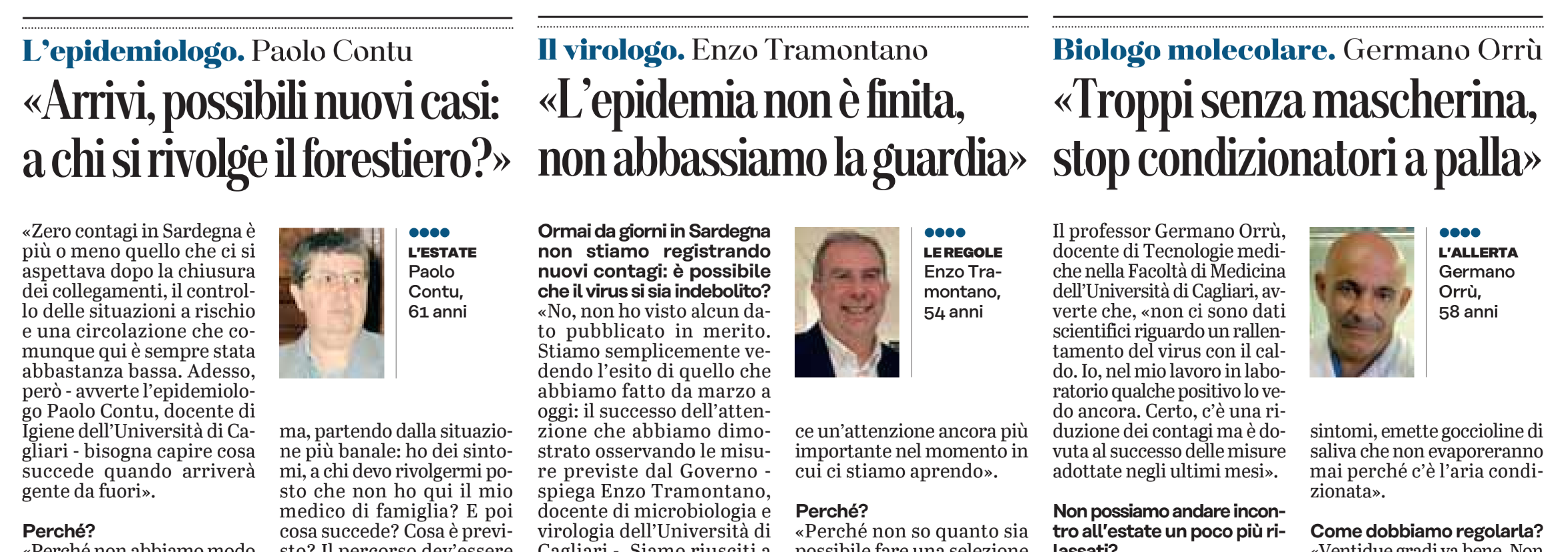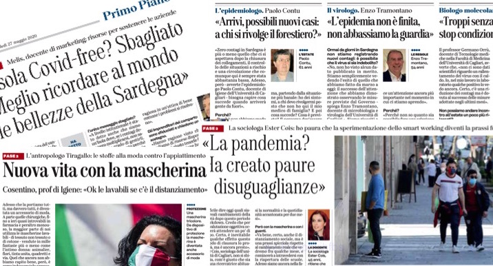 A metà maggio ancora due presenze di pregio su “L’Unione Sarda”, con Paolo Contu sull’indice Rt, e Franciscu Sedda (docente di Semiotica in Studi umanistici) sul Piano B per il turismo della Sardegna, quest'ultima richiamata anche sulla prima pagina del quotidiano.
