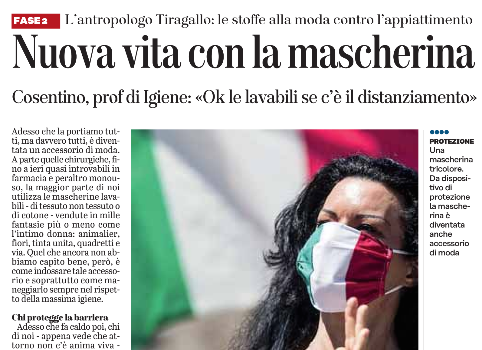 Tutti interventi importanti, nei giorni giusti, come domenica scorsa, quando Sofia Cosentino e Felice Tiragallo (docente di Antropologia) sono stati intervistati da Piera Serusi per “L’Unione Sarda” sulla progressiva trasformazione delle mascherine da strumento di protezione personale a irrinunciabile accessorio di outfit (qui l'intervista integrale ai proff. Cosentino e Tiragallo): un tema che la prof.ssa Cosentino ha trattato anche nell’intervista rilasciata pochi giorni prima a Rossella Romano per il TG della RAI.