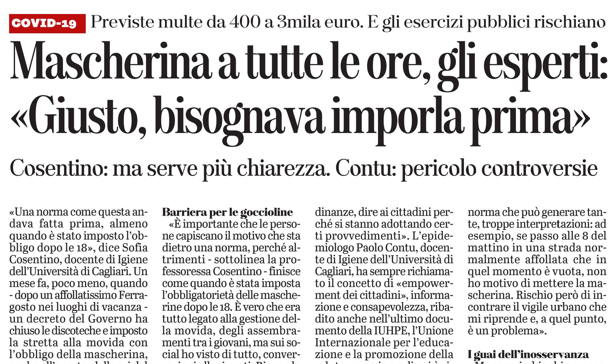 Gli ultimi interventi in ordine di tempo sono quelli di Sofia Cosentino e Paolo Contu a proposito della recente ordinanza regionale, nell’articolo su L’Unione Sarda del 13 settembre firmato da Piera Serusi. La professoressa ha rimarcato la necessità di indossare la mascherina per proteggere se stessi e chi ci sta intorno. Il docente di Igiene punta sull’empowerment del cittadino: “Bisogna far sì che i cittadini ragionino, sostenendo la loro capacità di autoregolarsi e aiutandoli perciò ad avere le idee chiare”.