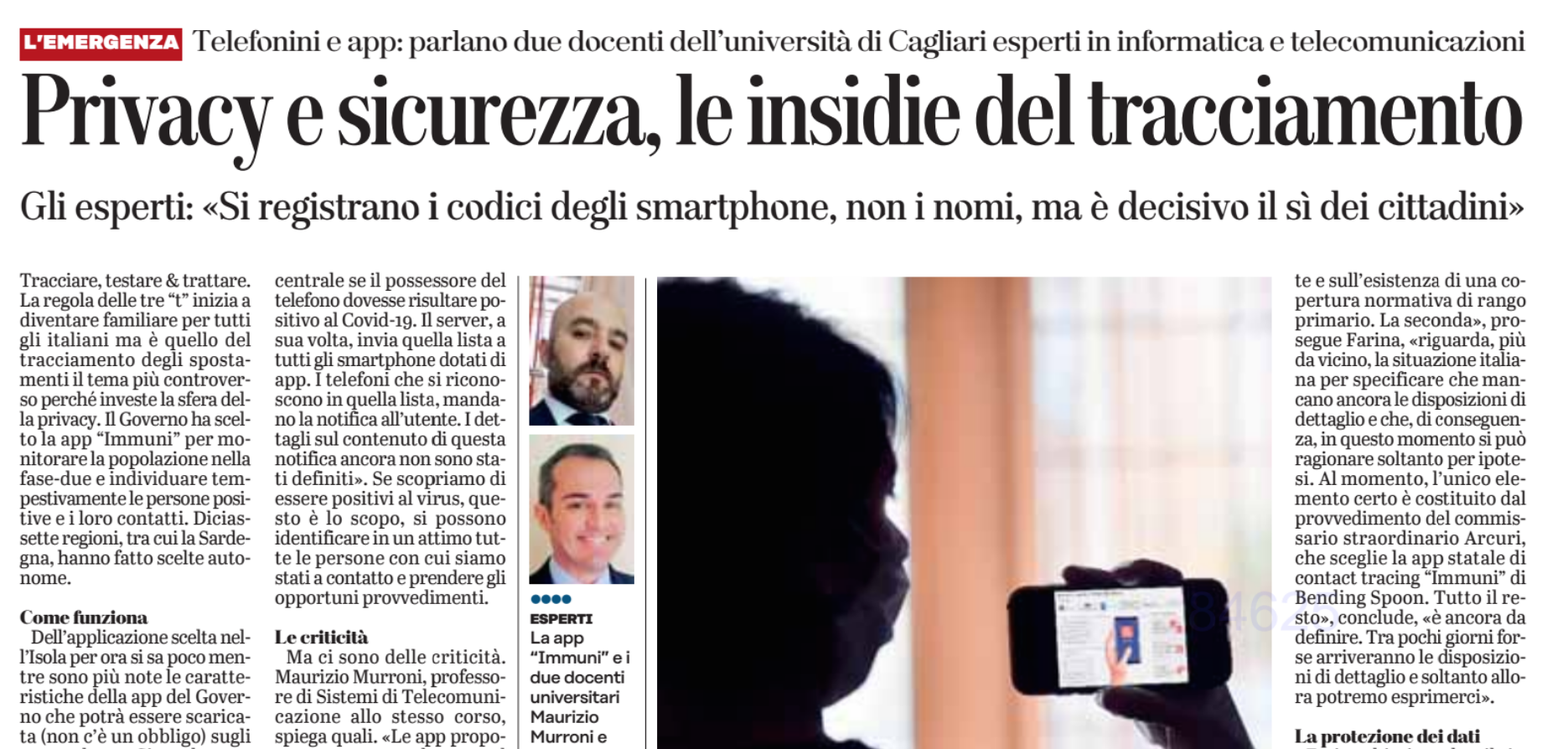 Sono tanti i campi su cui i docenti di UniCa intervengono: i docenti del DIEE Maurizio Murroni e Massimo Farina, ad esempio, sono stati intervistati da Fabio Manca per “L’Unione Sarda” sulle insidie del tracciamento derivante dall’uso della app di cui tanto si parla in queste settimane. Il docente di Sistemi di Telecomunicazioni e il Data Protection Officer (DPO) dell’Ateneo hanno guidato i lettori del quotidiano sardo alla scoperta dei dettagli di quanto potrebbe accadere a breve (l'intervista integrale è disponibile nella versione on line del quotidiano).