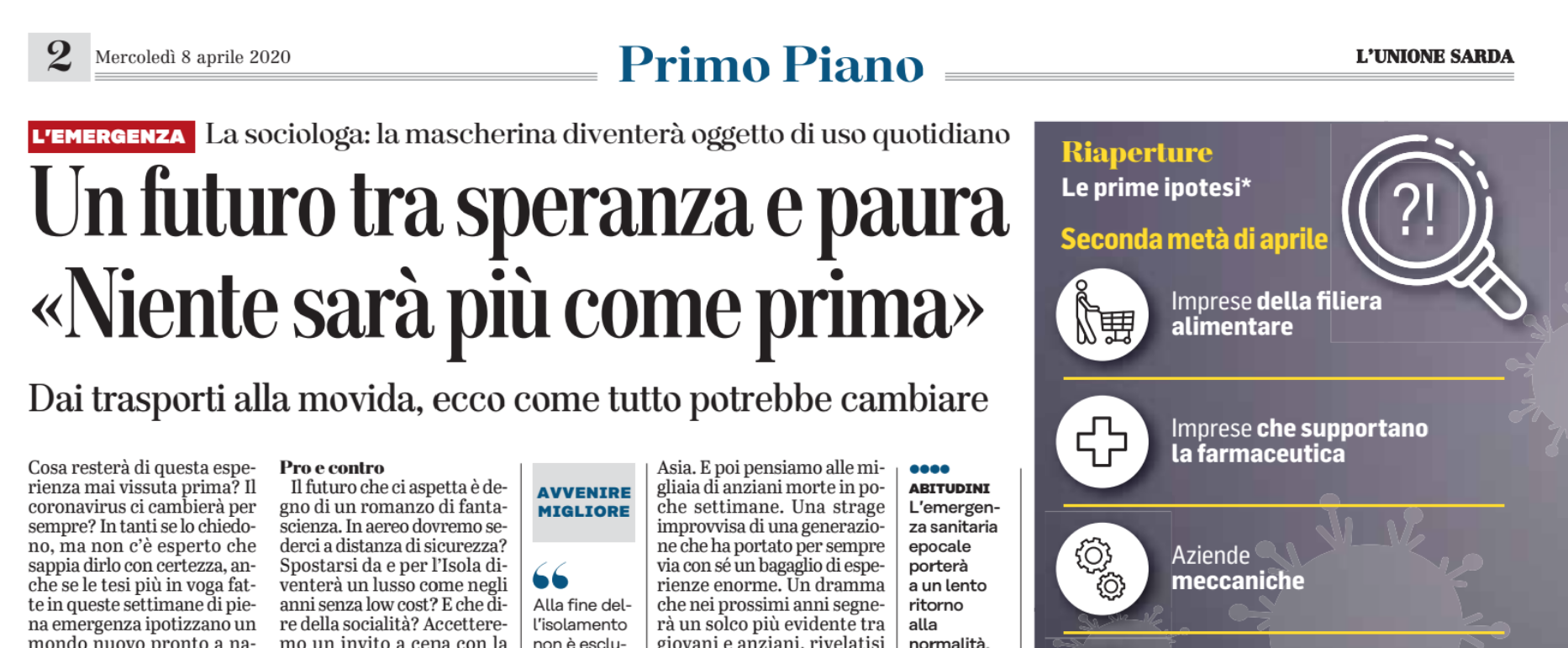 Ma non basta: ieri Sofia Cosentino è stata intervistata dal TG della RAI, per spiegare a Chiara Zammitti le precauzioni più corrette da adottare nella Fase 2, mentre oggi "L'Unione Sarda" dà ampio spazio alla ricerca coordinata da Cristina Cabras - docente di Psicologia sociale al Dipartimento di Pedagogia, Psicologia e Filosofia - sulle conseguenze della pandemia. L'articolo di Giuseppe Meloni fa il punto sui questionari somministrati e sulle finalità dell'indagine.
