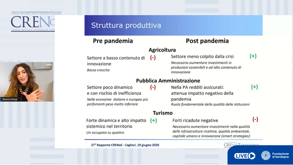 Il Rapporto 2020 è stato presentato ieri pomeriggio - in una insolita veste all'interno di un webinar - da Bianca Biagi e Barbara Dettori, rispettivamente dell'Università di Sassari e Cagliari, con un intervento di Giacomo Del Chiappa (UniSS), e i saluti di Emanuela Marrocu, direttrice CRENoS, e Carlo Mannoni, Direttore generale Fondazione di Sardegna. Ha fatto seguito un dibattito a più voci coordinato da Raffaele Paci, docente di Economia Politica di UniCa. "Lo shock di offerta non deve trasformarsi in uno shock di domanda - ha spiegato il docente - perchè si protrarrebbe per tanti anni, sarebbe analogo alla precedente crisi finanziaria. Sono tanti gli interventi istituzionali messi in campo ai vari livelli, per complessivi 220 miliardi spettanti teoricamente all'Italia".