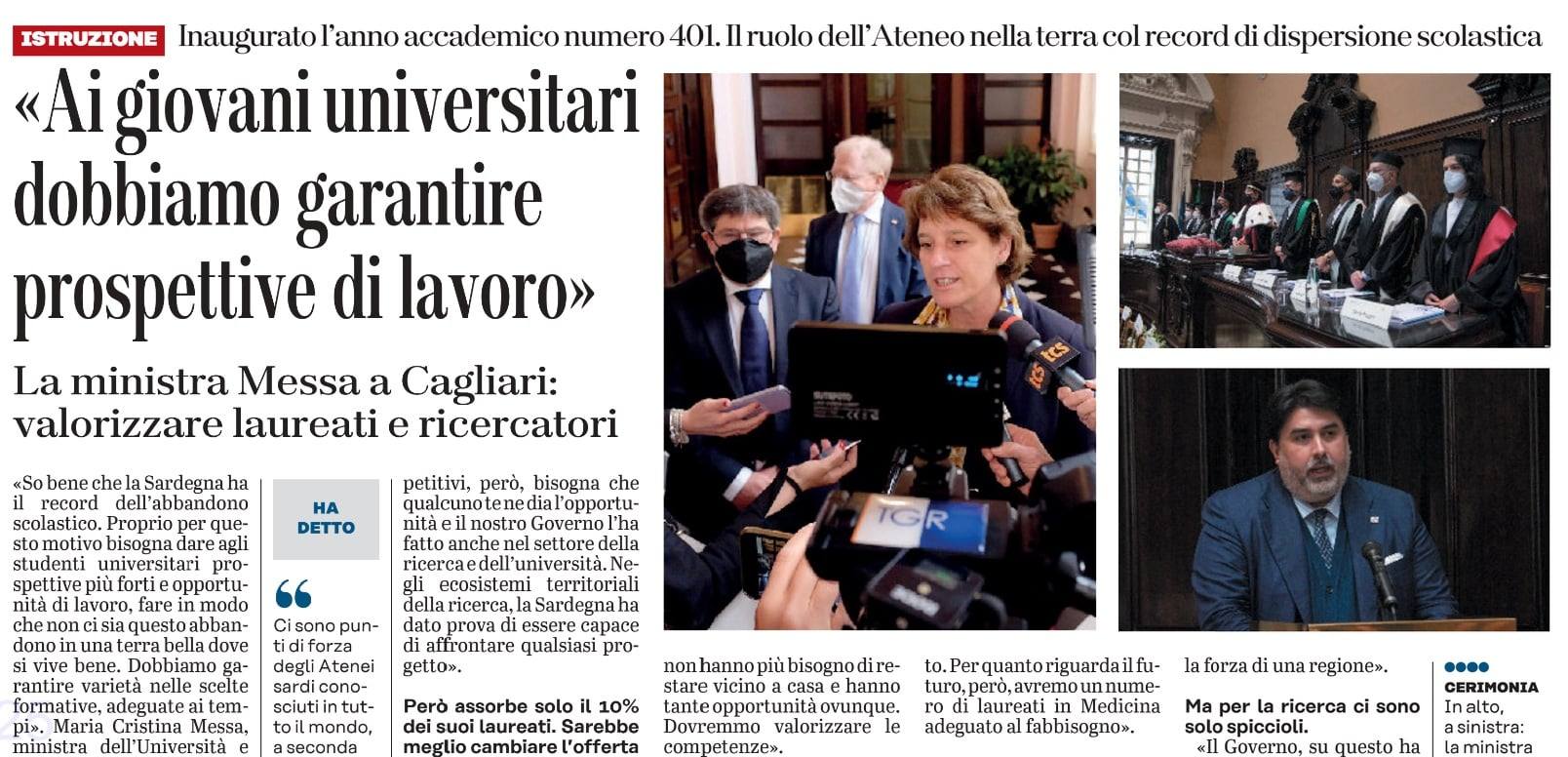 Maria Cristina Messa, ministra dell'Università e della ricerca ed ex rettrice dell'Ateneo Milano-Bicocca, conosce le difficoltà che l'Isola vive nel trattenere a scuola i suoi figli: troppi non giungono al traguardo. Ieri a Cagliari ospite del rettore Francesco Mola per l'inaugurazione dell'anno accademico numero 401, sa che i giovani qui si "disperdono" assai più che nel resto d'Italia. Eppure, i sardi sanno farsi notare fuori anche fuori dall'Isola.