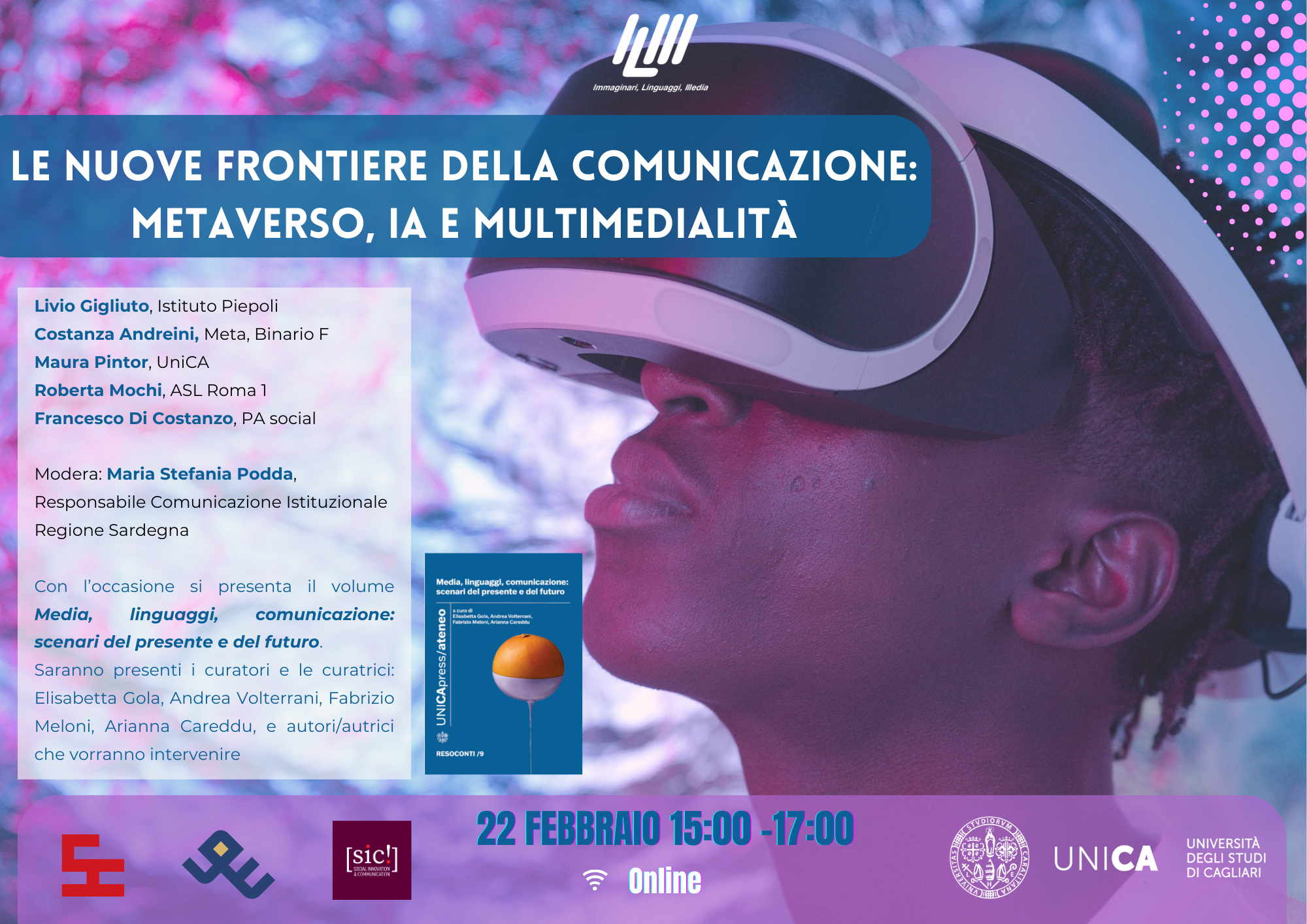 Con l’occasione si presenta il volume pubblicato da UnicaPress "Media, linguaggi, comunicazione: scenari del presente e del futuro". Saranno presenti i curatori e le curatrici: Elisabetta Gola, Andrea Volterrani, Fabrizio Meloni, Arianna Careddu, e autori/autrici che vorranno intervenire.